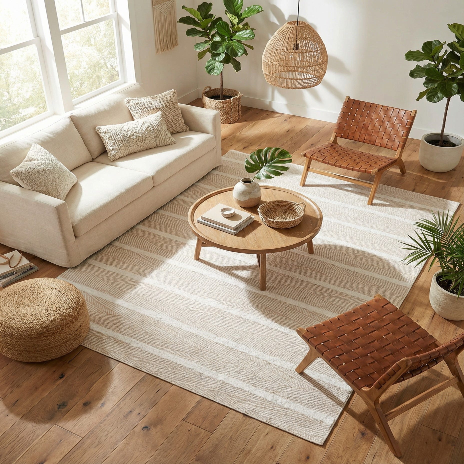 This neutral palette and restrained pattern work well in light-filled living rooms, under a coffee table, or layered at the foot of a bed. Pair it with pale woods and linen upholstery for a coastal or Scandinavian-inspired scheme, or soften a modern farmhouse or minimalist space by adding woven baskets and warm metallic accents. The rug’s understated design makes it easy to coordinate with patterned throw pillows or textured blankets while keeping the overall look calm and cohesive.