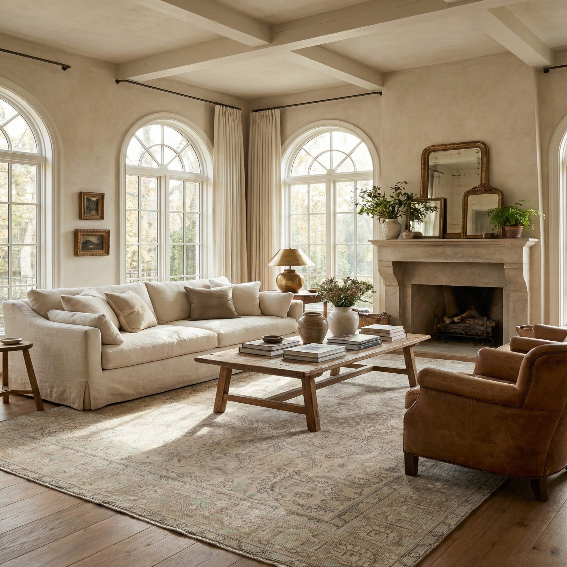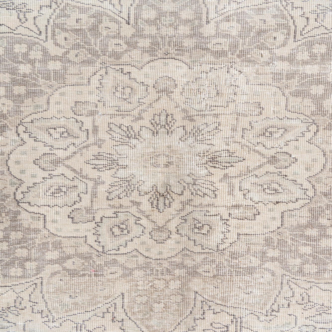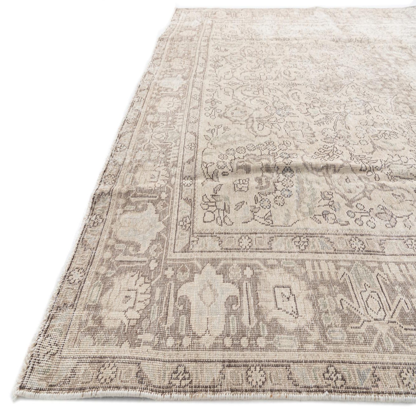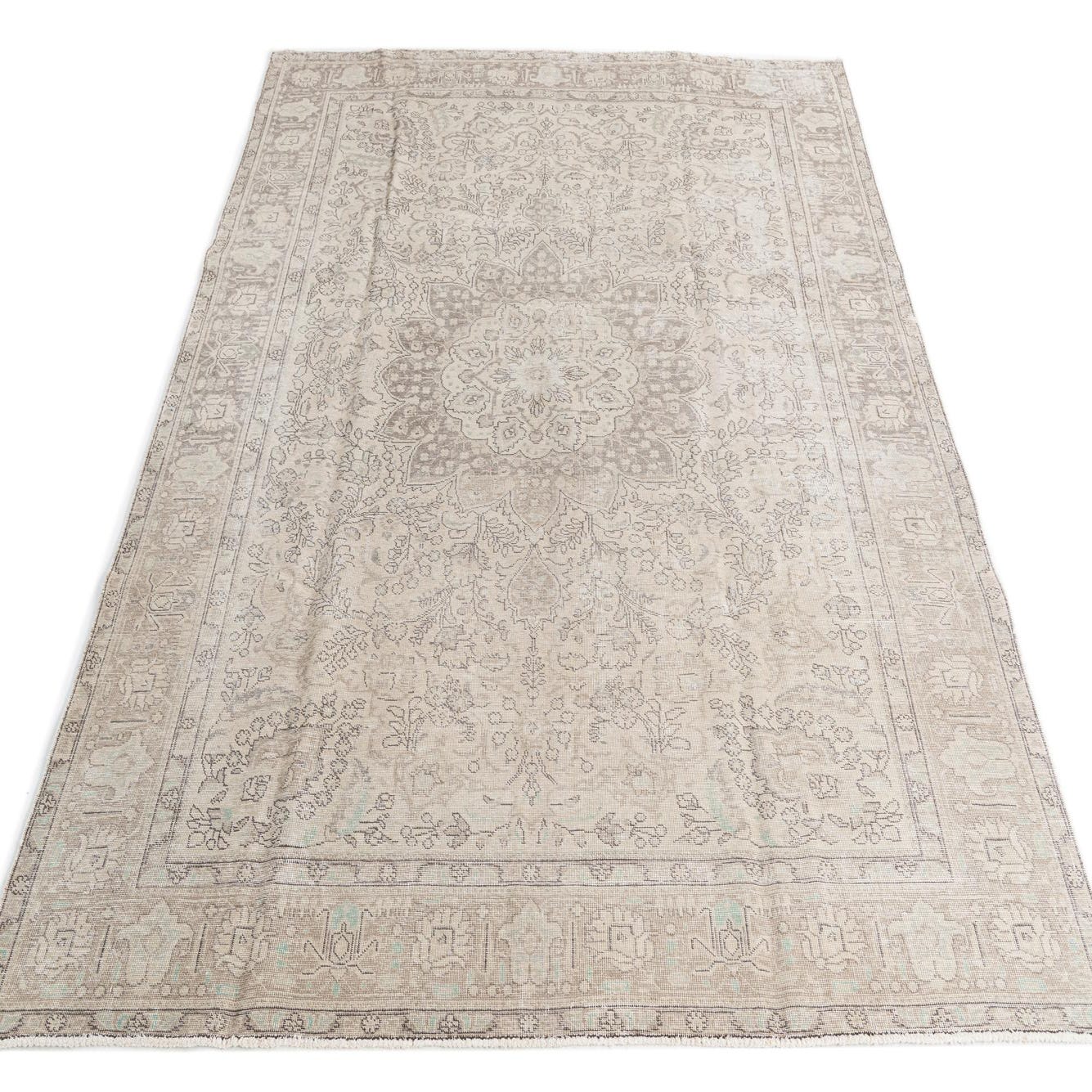 An 8x10 rectangular Ultra Vintage wool rug with a faded Persian medallion pattern in browns, tans, and ivories.