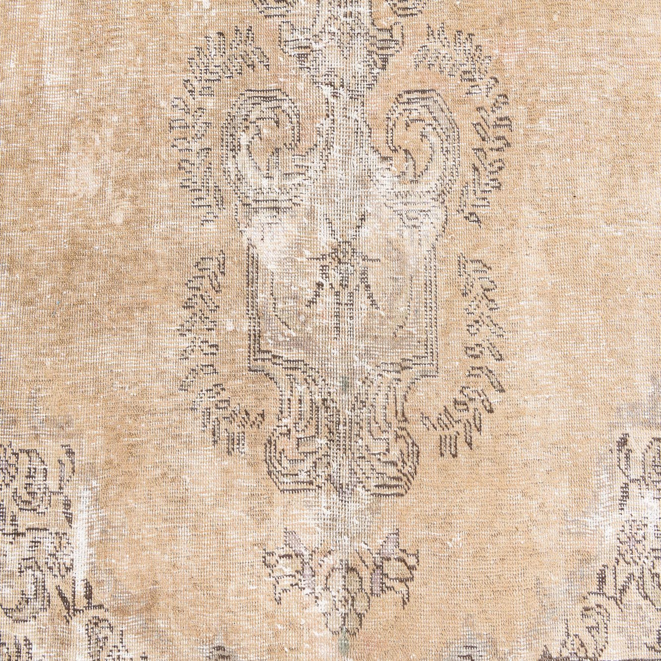 A softly faded central medallion and an ornate floral border give this hand-knotted, 100% wool rug a vintage-inspired look with deliberate wear for a lived-in character. The background is a warm beige that anchors the design while fine linework in black, brown, gray and hints of green trace the medallion and scrolling border motifs. Underhand, the wool feels substantial and warm; the hand-knotted construction produces subtle variations in pile and texture that catch light and enhance the rug’s antique appearance.