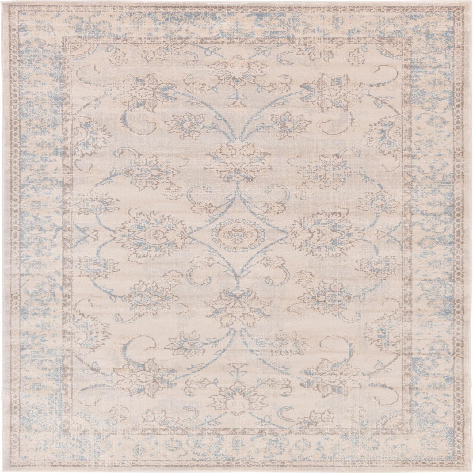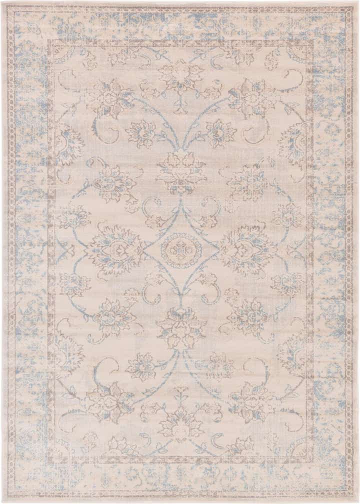 The Victoria collection rug is a sophisticated addition to any space, measuring 8x10 feet and machine woven from 100% polypropylene for durability. The design showcases a classic and elegant pattern with intricate floral motifs, offering a timeless appeal. The soft beige background is harmoniously complemented by accents in blue, gray, and light brown hues that add subtle color and visual interest without overwhelming your decor.