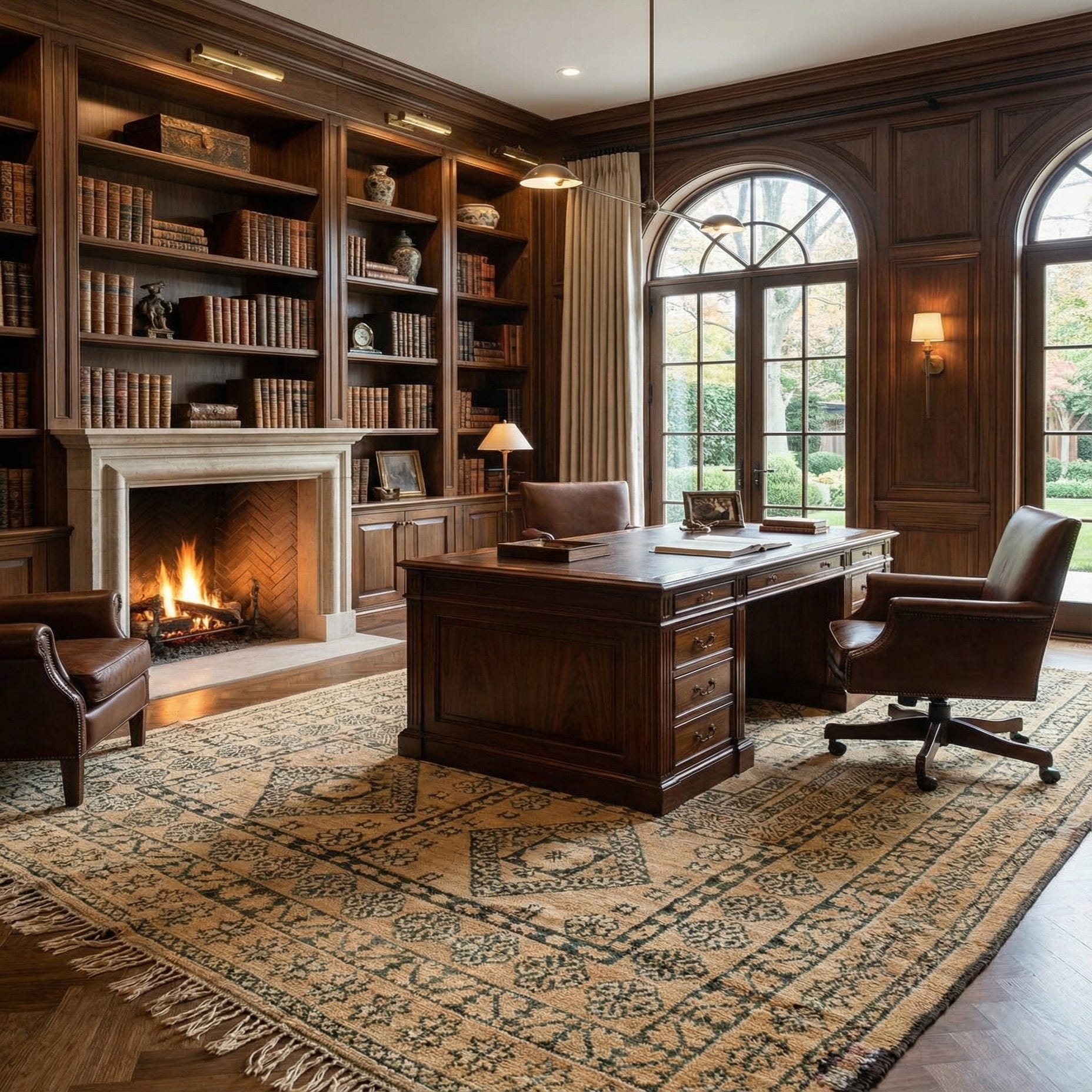 A rectangular 8x11 Berber wool rug in shades of brown and tan with intricate geometric patterns and fringed edges.