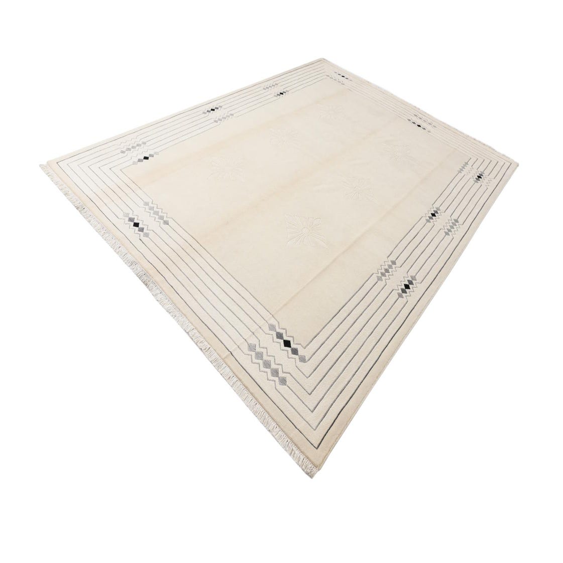 The Darya collection offers a refined hand-knotted rug crafted from 100% wool, presenting a plush feel underfoot and notable durability. This 8x11 piece features a Beige background enriched by a Cream, Gray, Silver, and Black palette that complements the rug's minimalistic design. Its decorative pattern boasts geometric borders punctuating the perimeter, along with a series of stylized floral medallions that lend a touch of elegance without overwhelming the space.