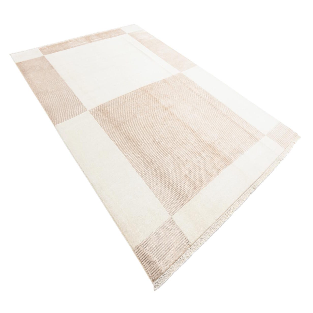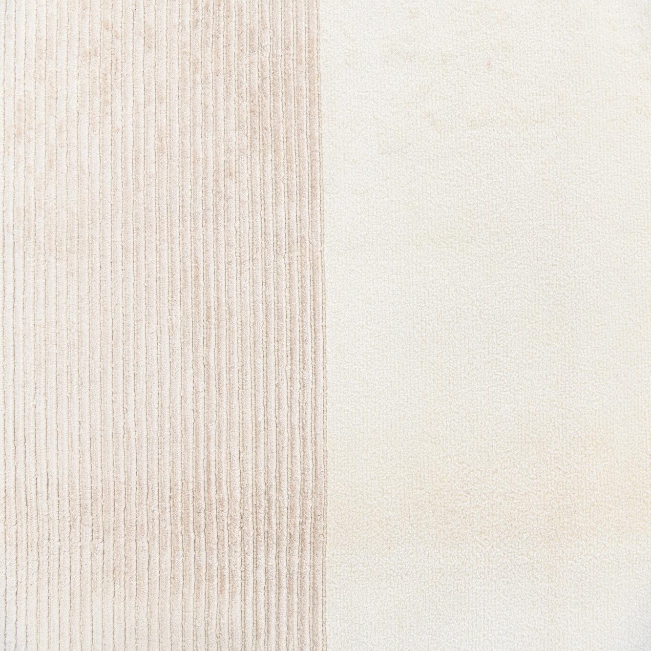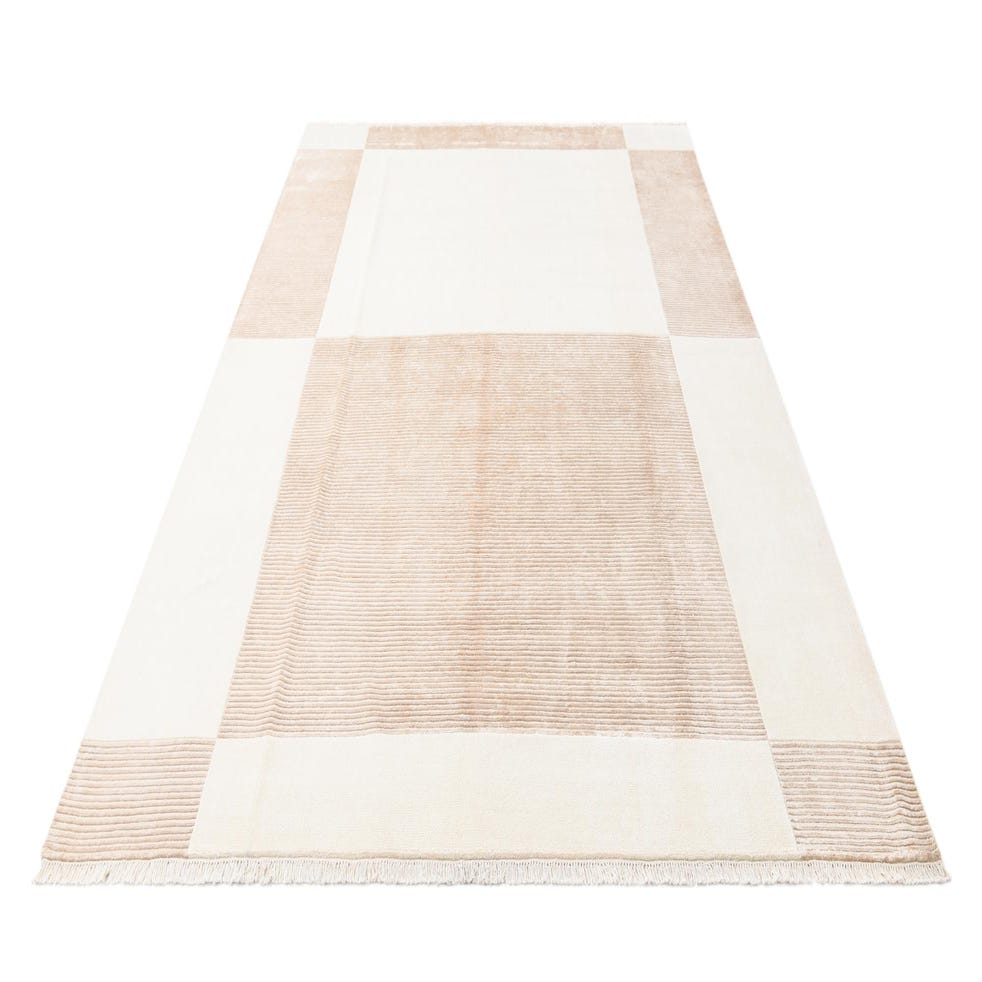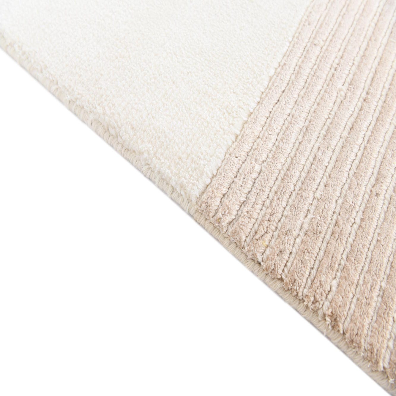The Darya Collection features a hand-knotted rug made of 100% wool, measuring 8x11 feet. This piece showcases a subtle yet sophisticated pattern with a harmonious blend of beige and light brown hues. The minimalist design includes distinct, wide stripes that create a serene and uncluttered look, set against the warm neutral beige background. The rug's low pile and tightly knotted construction ensure a dense, durable texture that promises longevity and ease in maintenance.
