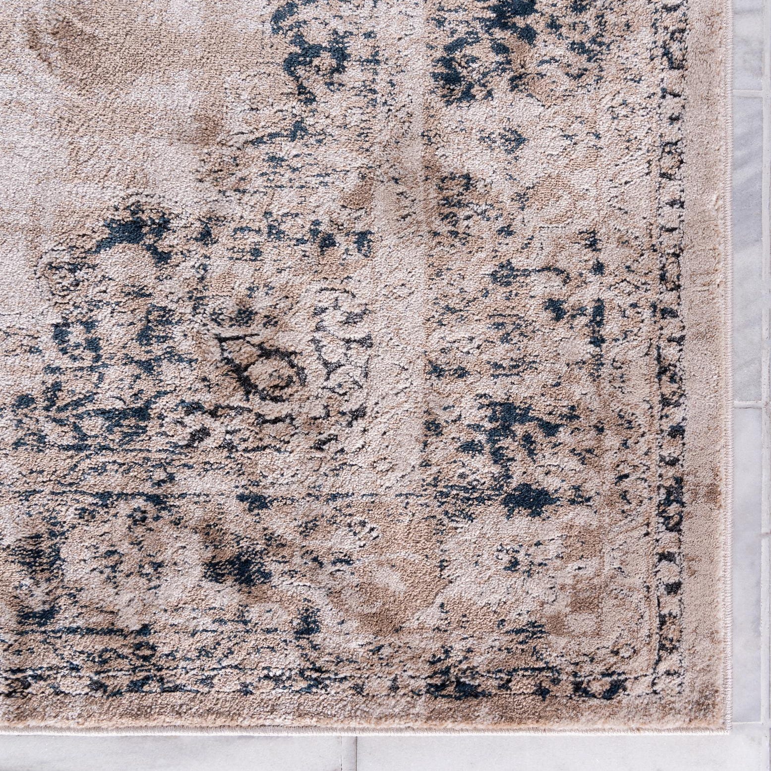 Primary color is Beige. Colors in this rug include: Beige, Ivory, Navy Blue.