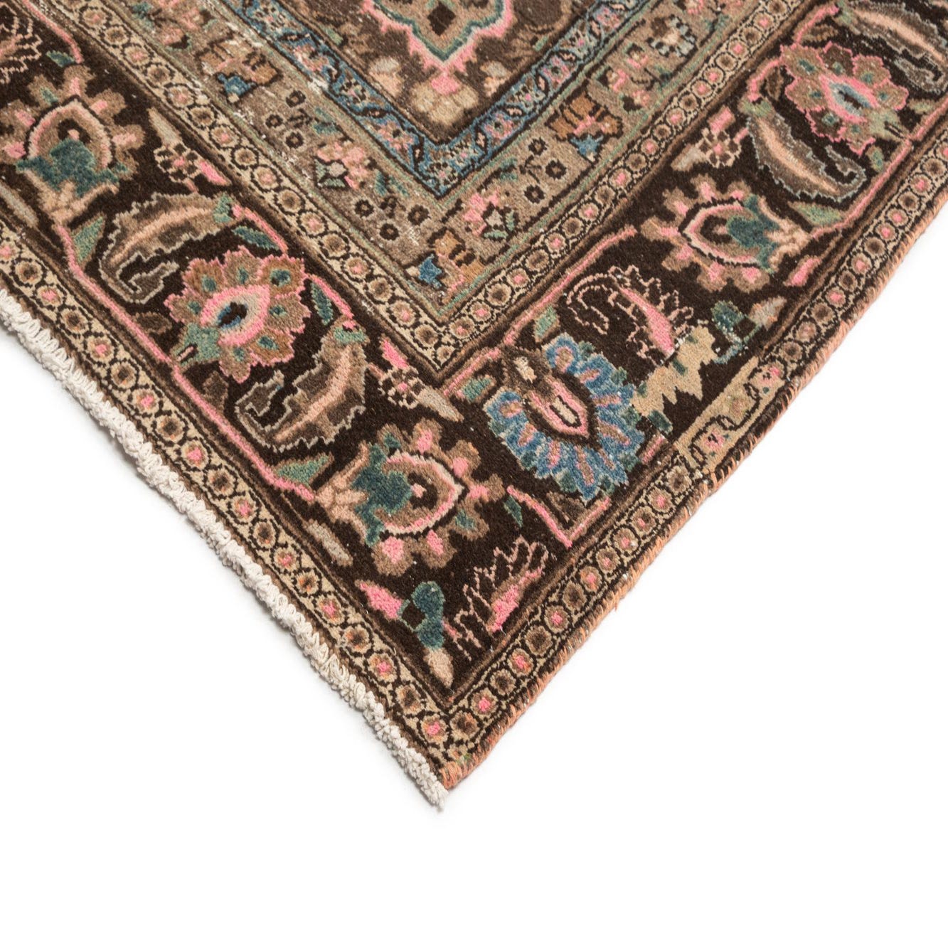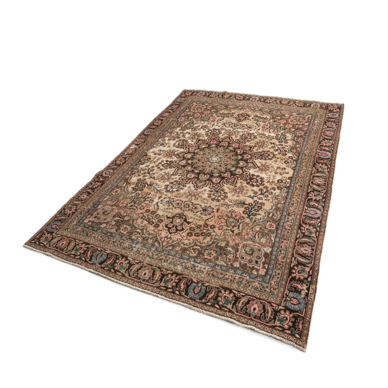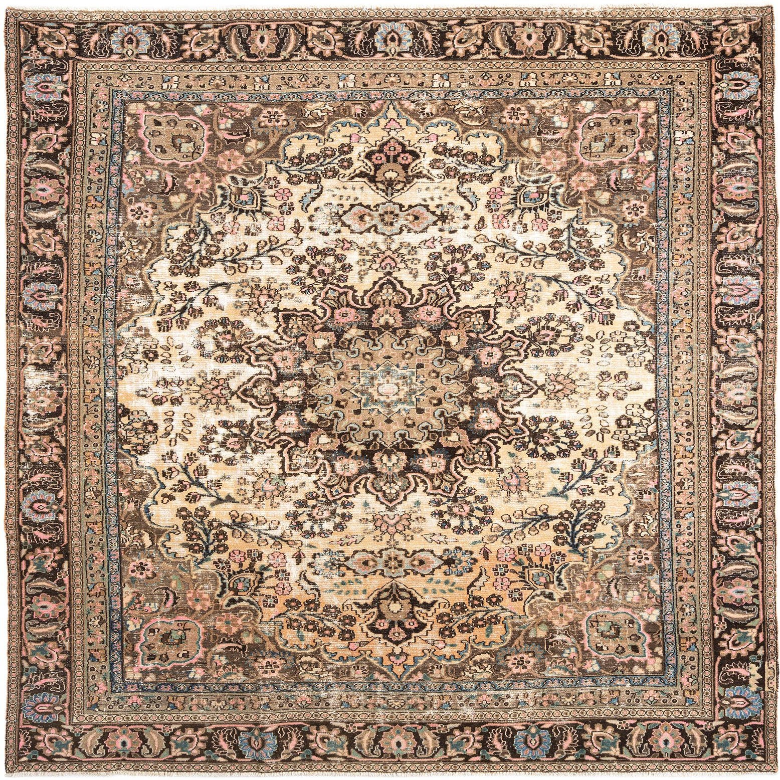 An 8x11 rectangular Hamedan Persian wool rug featuring a distressed floral medallion in browns, tans, and creams with hints of pink and blue.