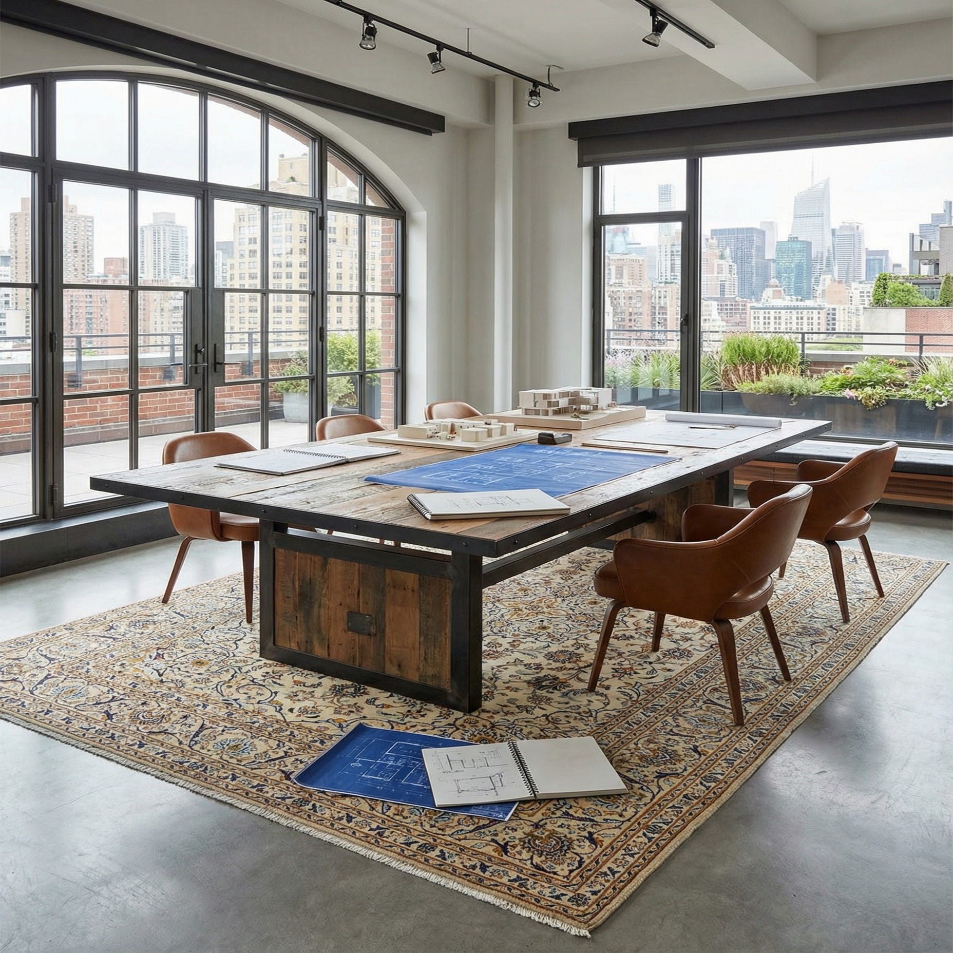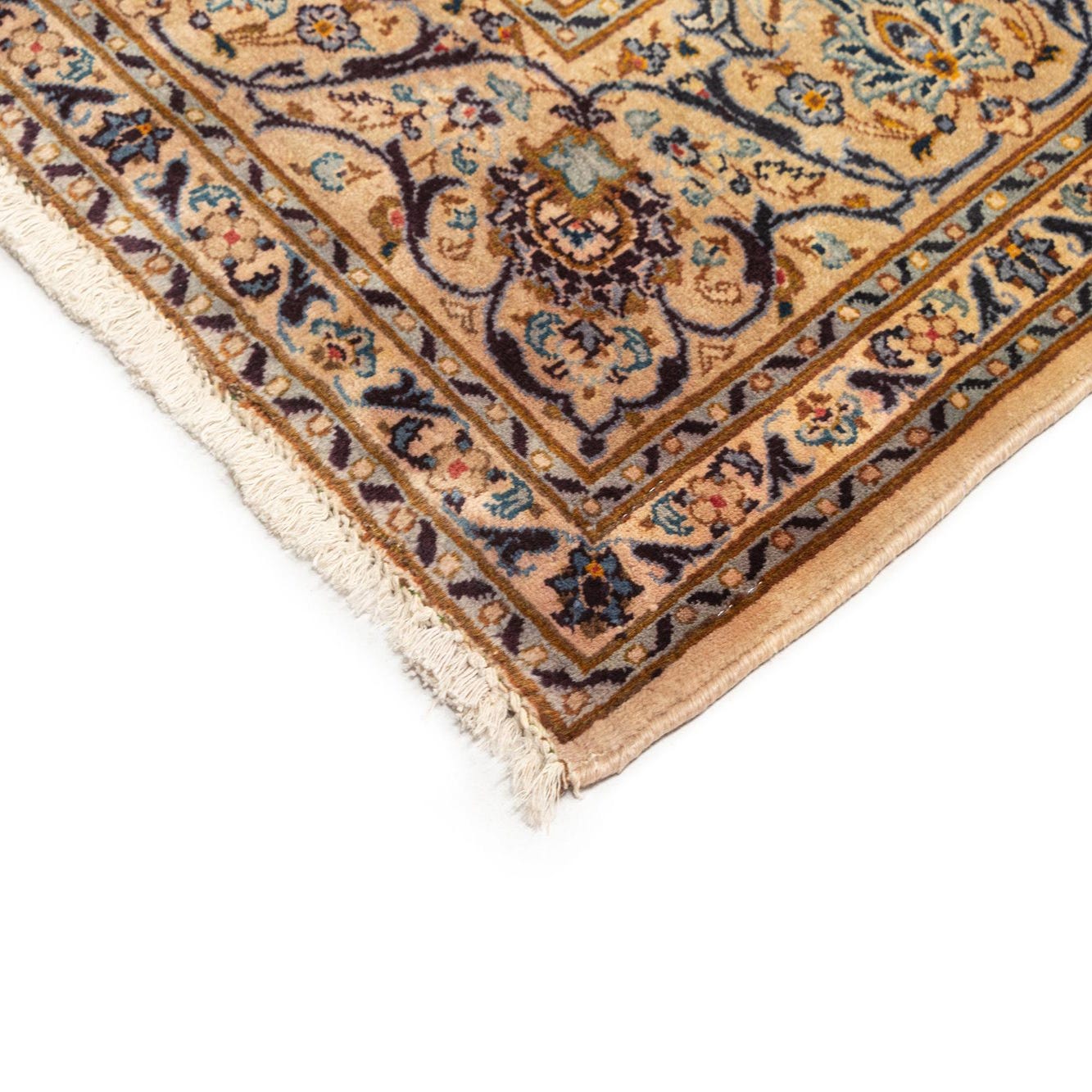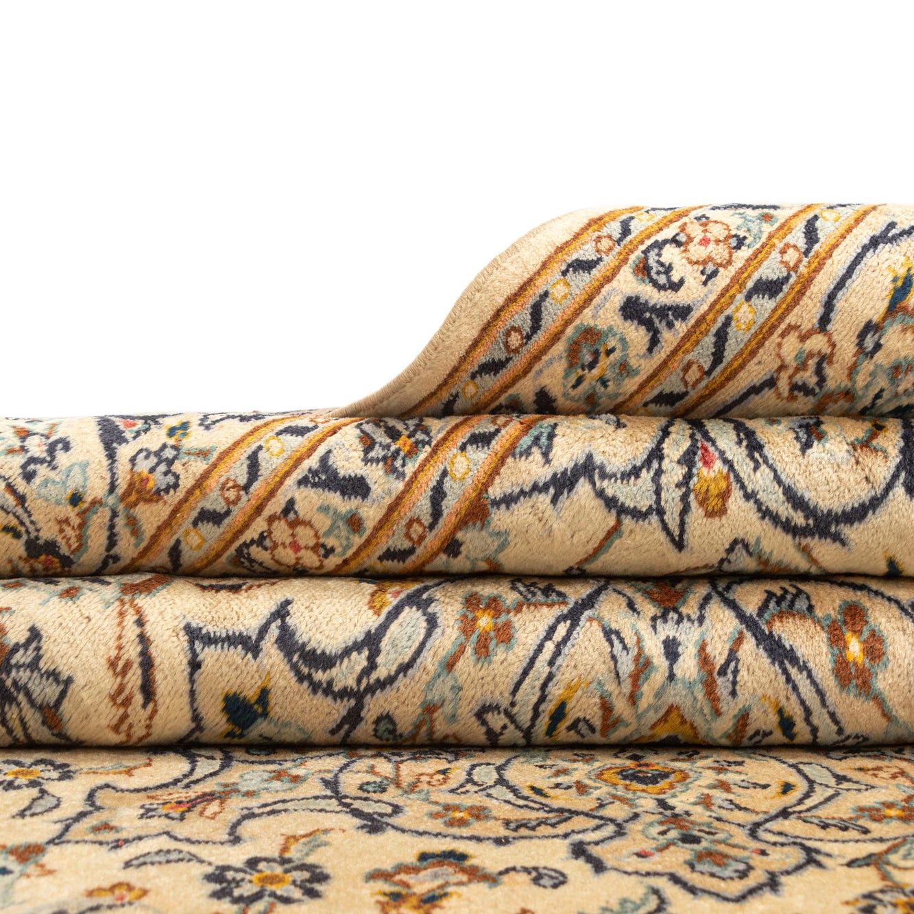 An 8x11 rectangular Kashan Persian rug in cream and brown, featuring intricate floral and medallion patterns.