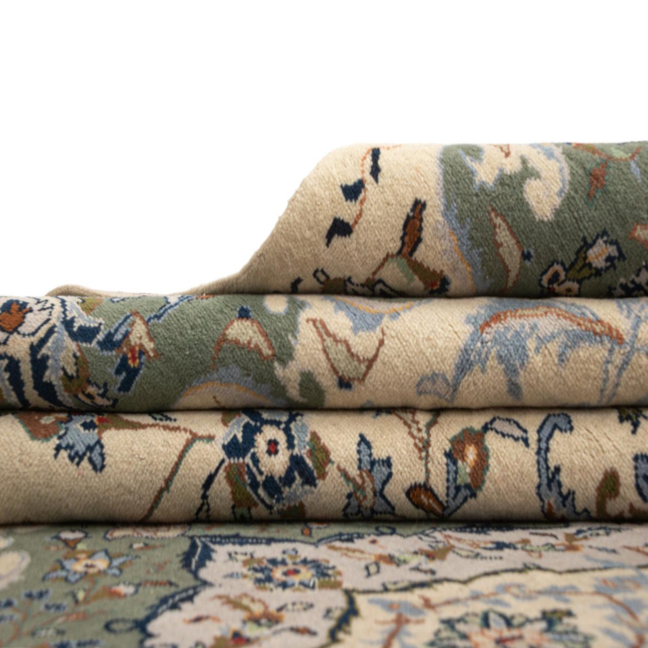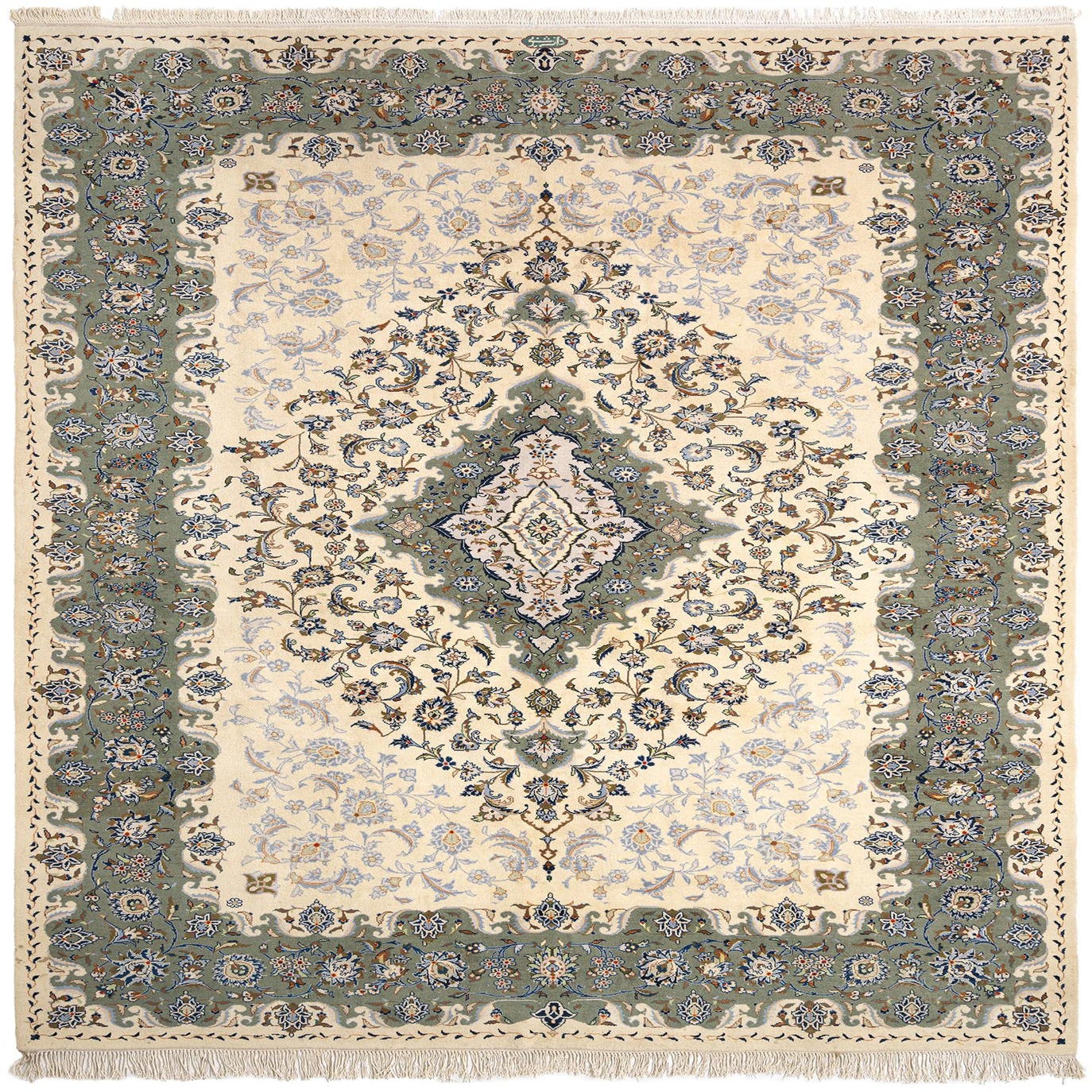 The Kashan collection presents a sophisticated 8x11 hand-made rug crafted from 100% wool, ensuring a plush and durable texture. The design features a richly detailed pattern accentuated by a harmonious blend of beige, cream, green, blue, dark blue, brown, and grey hues set against a warm beige background. Traditional motifs create an elegant focal point, ideal for adding a touch of refined style to any room.
