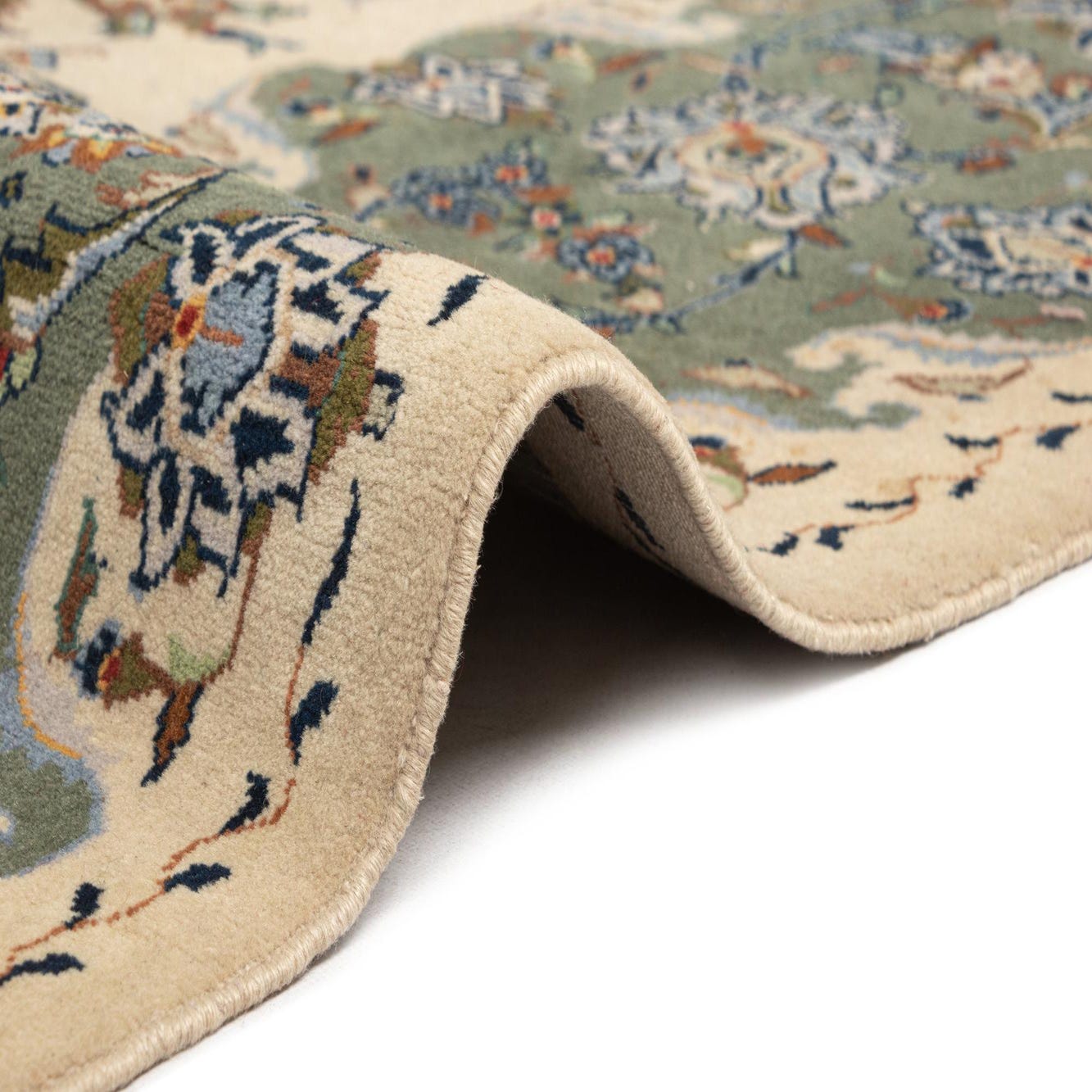 An 8x11 rectangular Persian rug with a cream field, sage green border, and intricate floral medallion pattern in blue and brown.