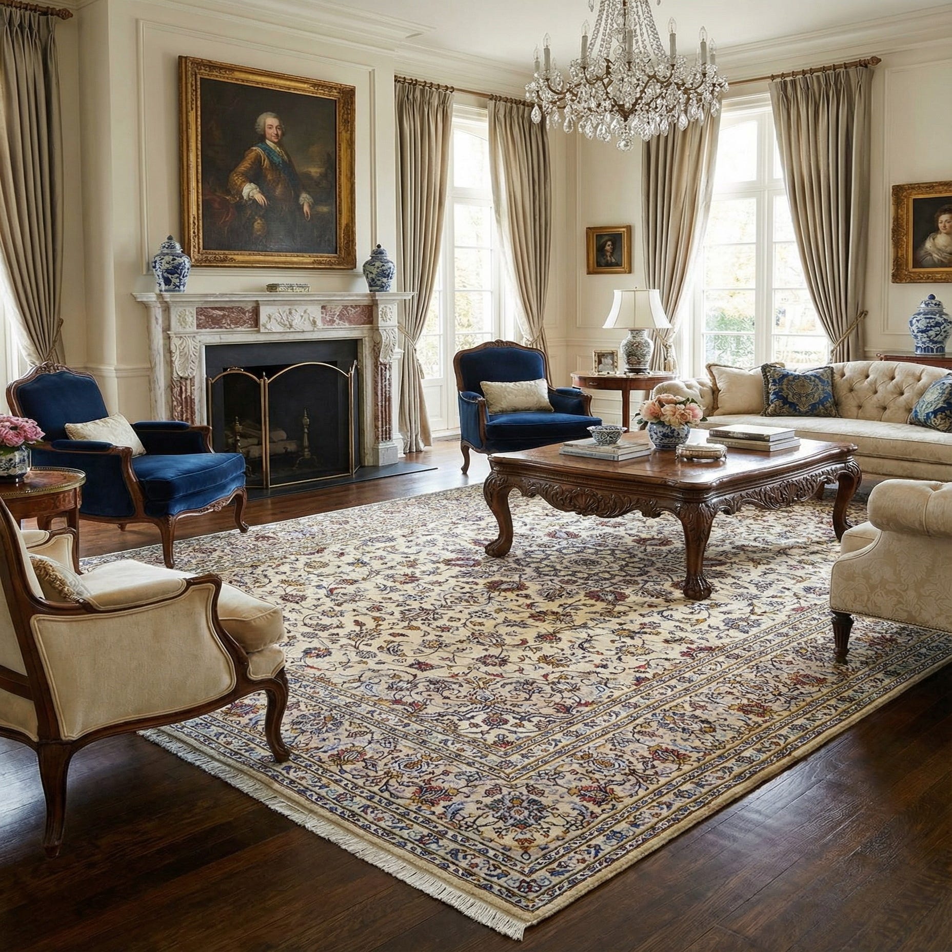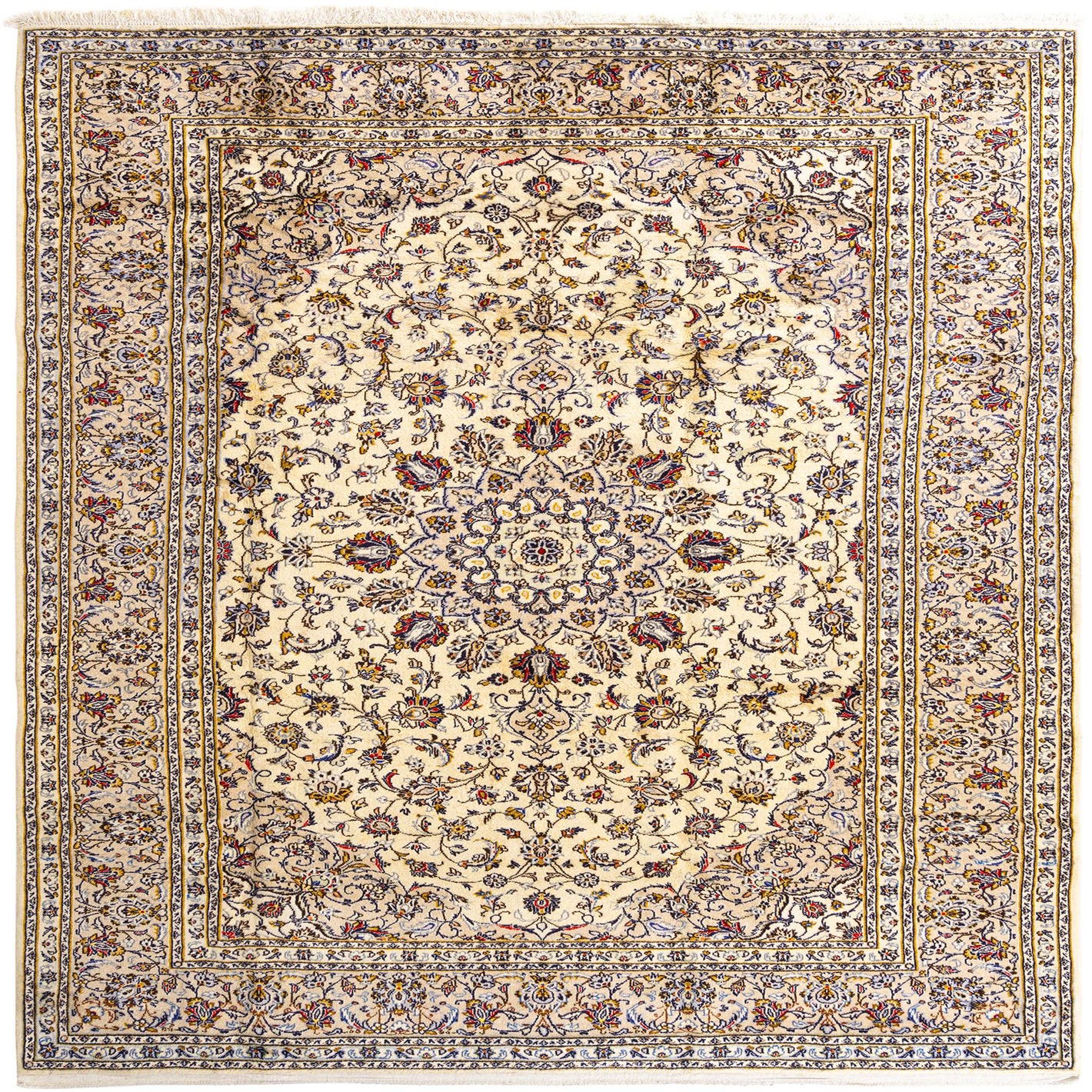 An 8x11 rectangular Persian rug with a cream field, intricate floral patterns in blue, red, and gold, and a detailed border.