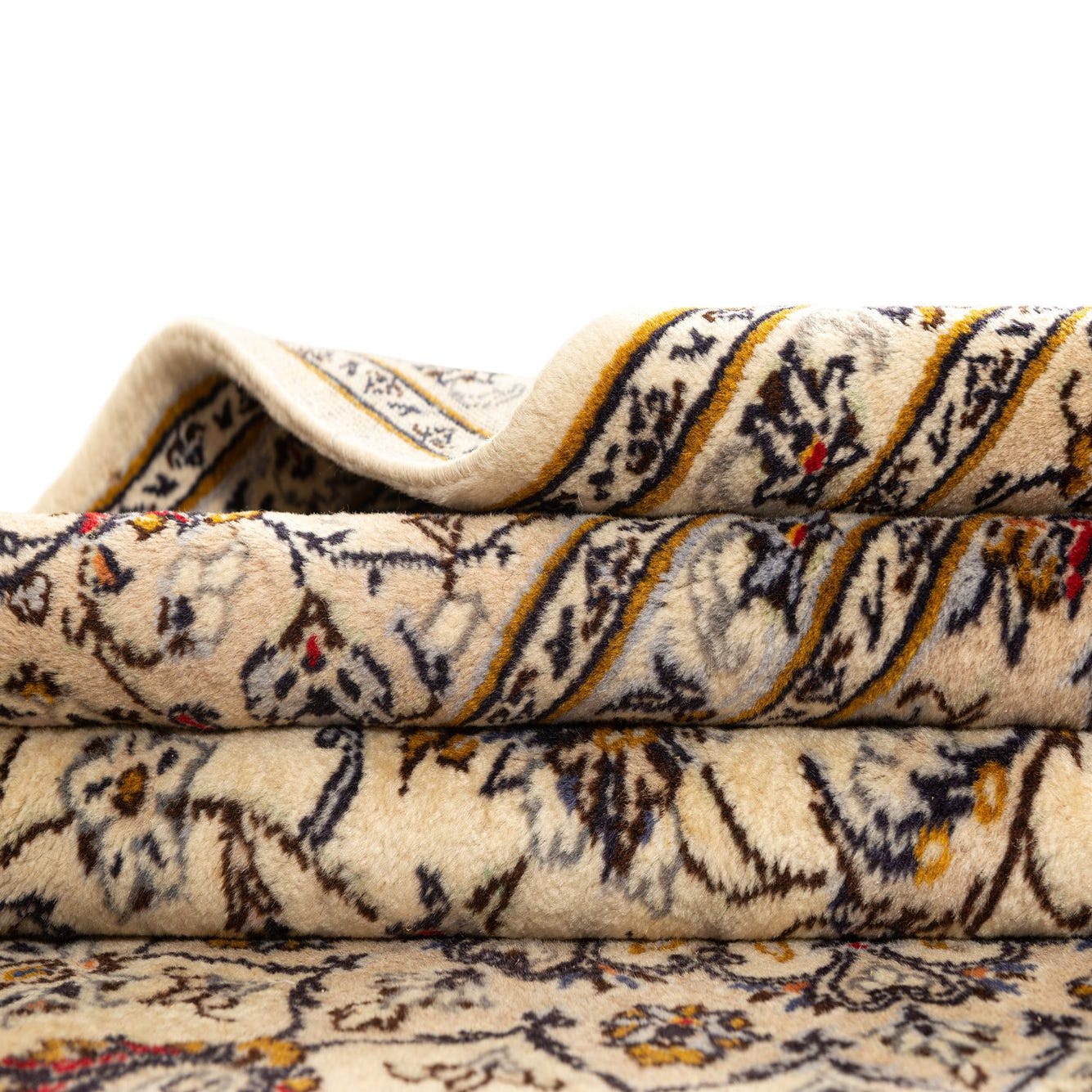 The rug is characterized by its detailed floral patterns and border, indicative of classic Persian designs. The texture of the hand-made wool contributes to the visual depth and tactile comfort, making it not only a visually appealing addition to any space but also a delight to walk upon. The meticulous craftsmanship is evident in the fine details and clean finishing of the rug.