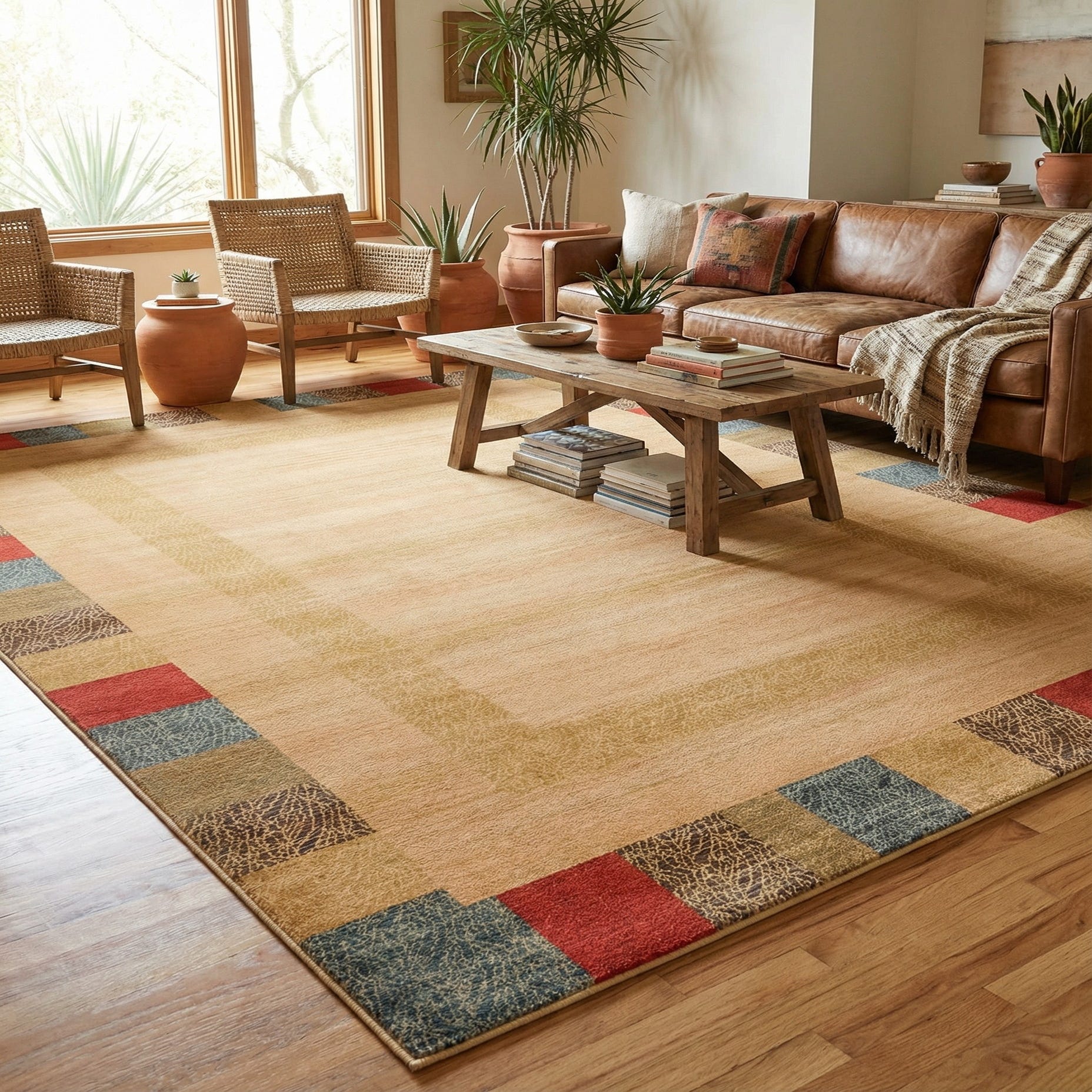 A warm beige field creates a calm, open center, layered with two tonal rectangular bands that give the rug a gentle sense of depth. A playful border of color-blocked squares brings in accents of red, navy blue, blue, light blue, light green, brown and light brown, while several blocks carry a linear, almost leaf-like textured motif for visual interest. The overall effect is contemporary with a subtle nod to traditional tribal geometry—clean, balanced, and quietly detailed.