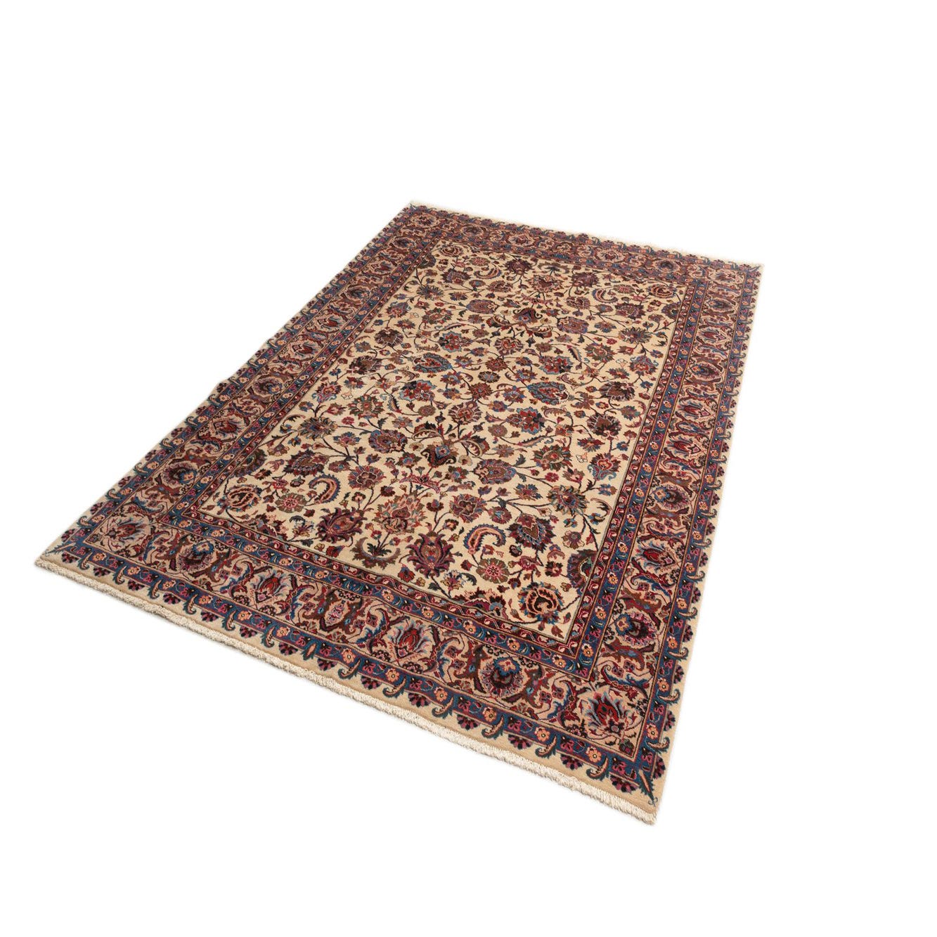 An 8x11 rectangular Kerman Persian rug with a cream field and intricate floral patterns in shades of brown, red, and blue, framed by a detailed border.