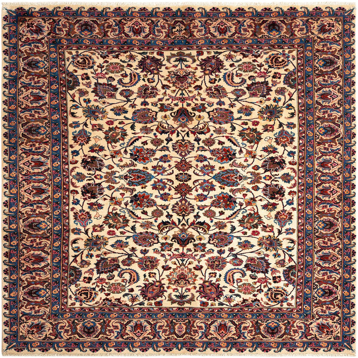 Primary color is Beige. Colors in this rug include: Beige, Beige, Blue, Pink, Red, Brown, Yellow.