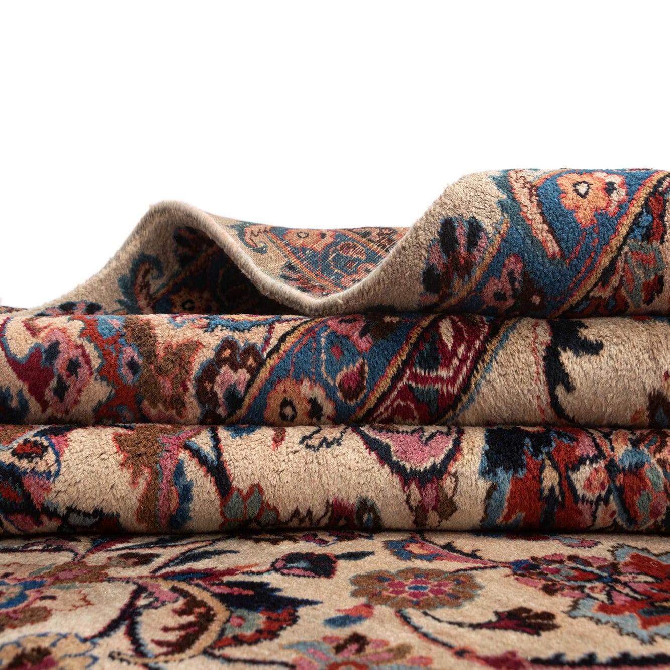 The Mashad collection showcases a refined 8x11 hand-made wool rug that presents a traditional design, featuring a dense array of floral motifs and intricate border detailing. The background color is a warm beige, which offers a neutral canvas for the rich palette of cream, dark blue, pink, blue, and brown accents. This tapestry of color is woven into the fabric, ensuring both visual depth and textural richness.