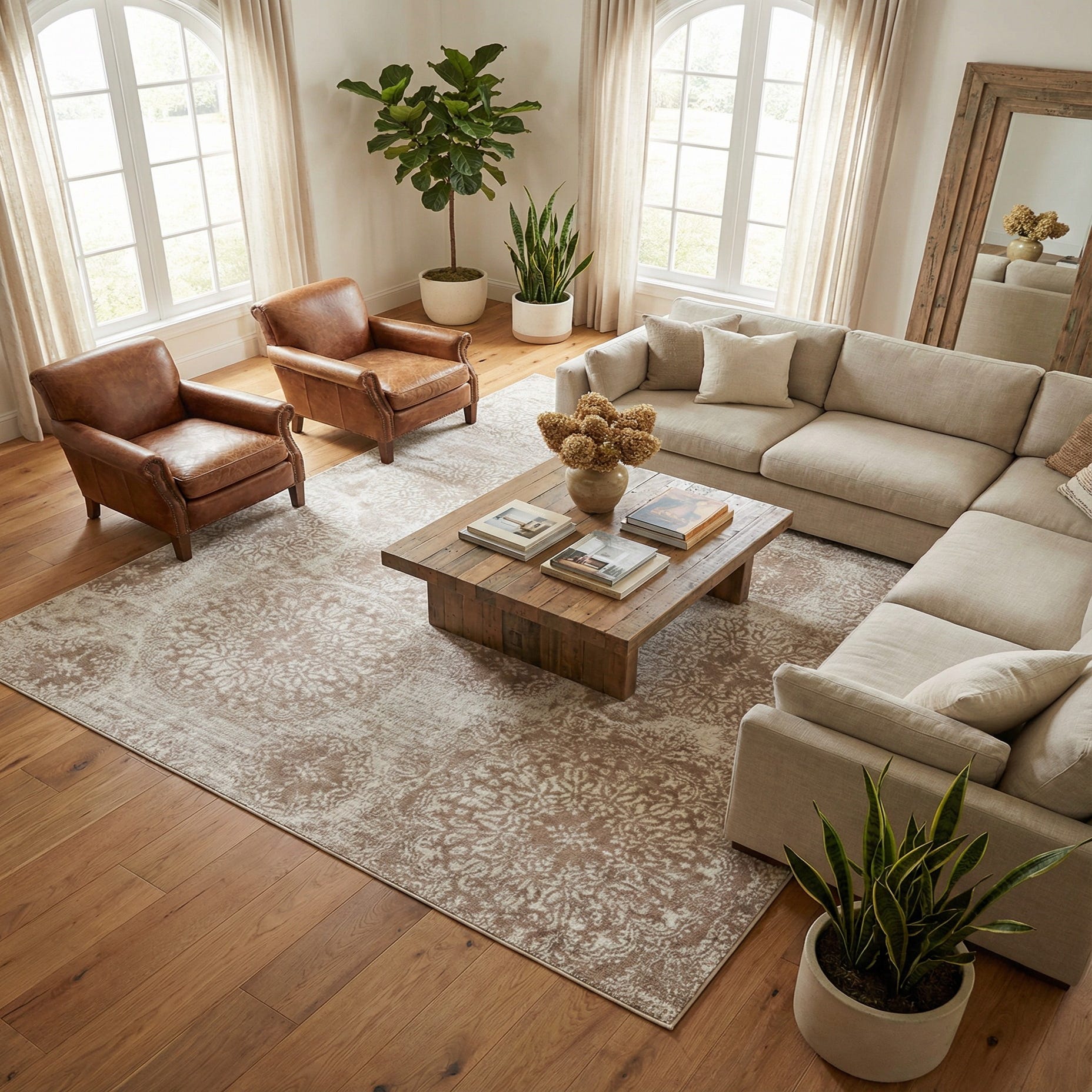 Warm and versatile, this rug pairs nicely with light-wood furniture, linen upholstery, and layered textiles for a relaxed, transitional living room or bedroom. It also works well beneath a dining table or as an anchor in an entry or seating area, complementing coastal, Scandinavian, or modern farmhouse schemes and balancing richer accent colors like navy, terracotta, or forest green.