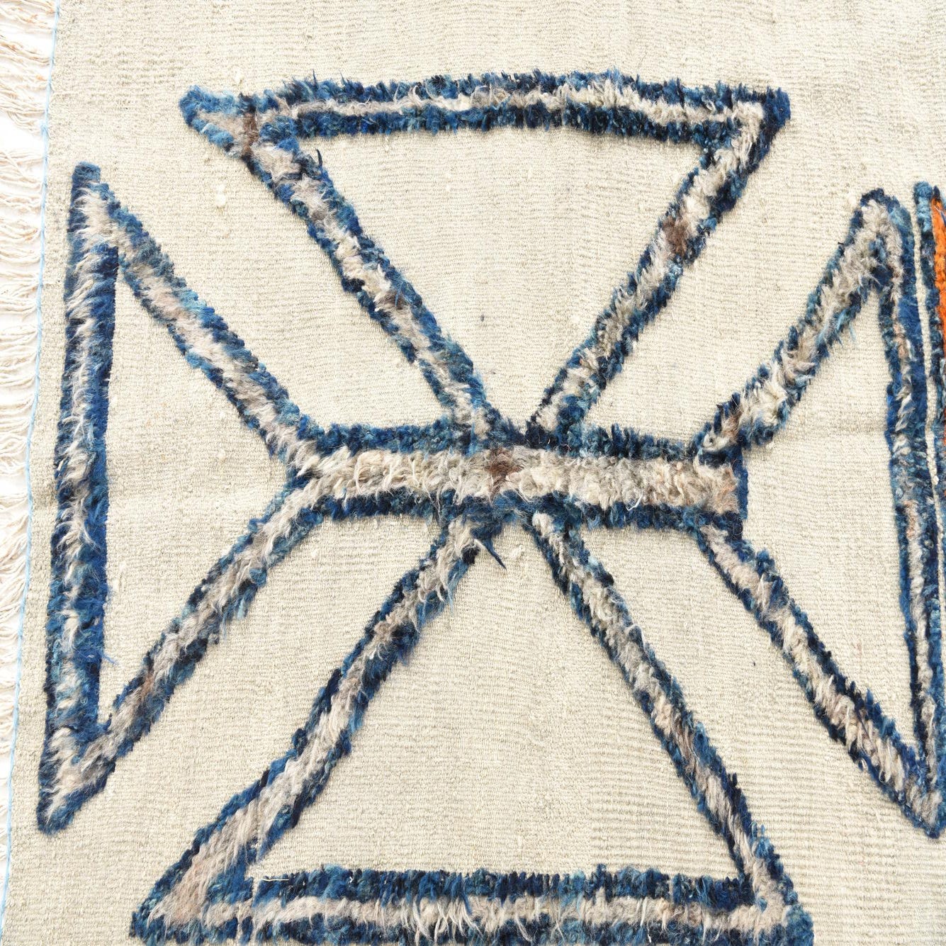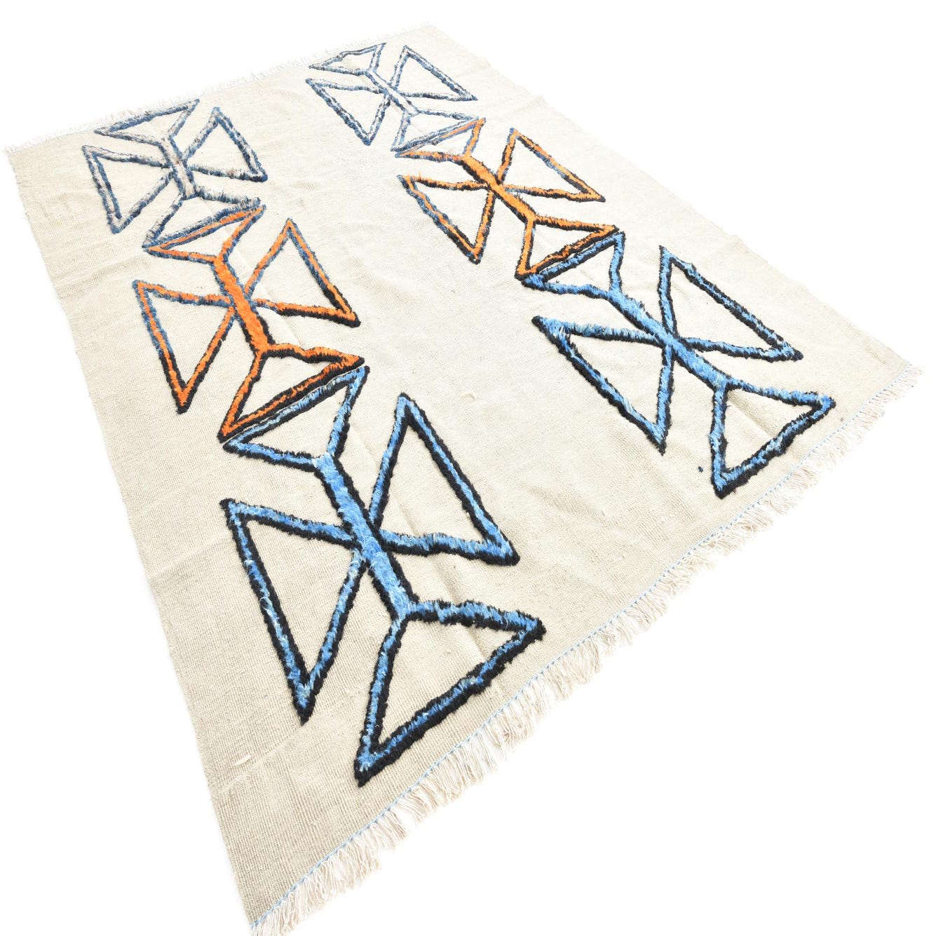 An 8x11 rectangular shag rug with a cream background and a tribal pattern of blue and orange abstract shapes.