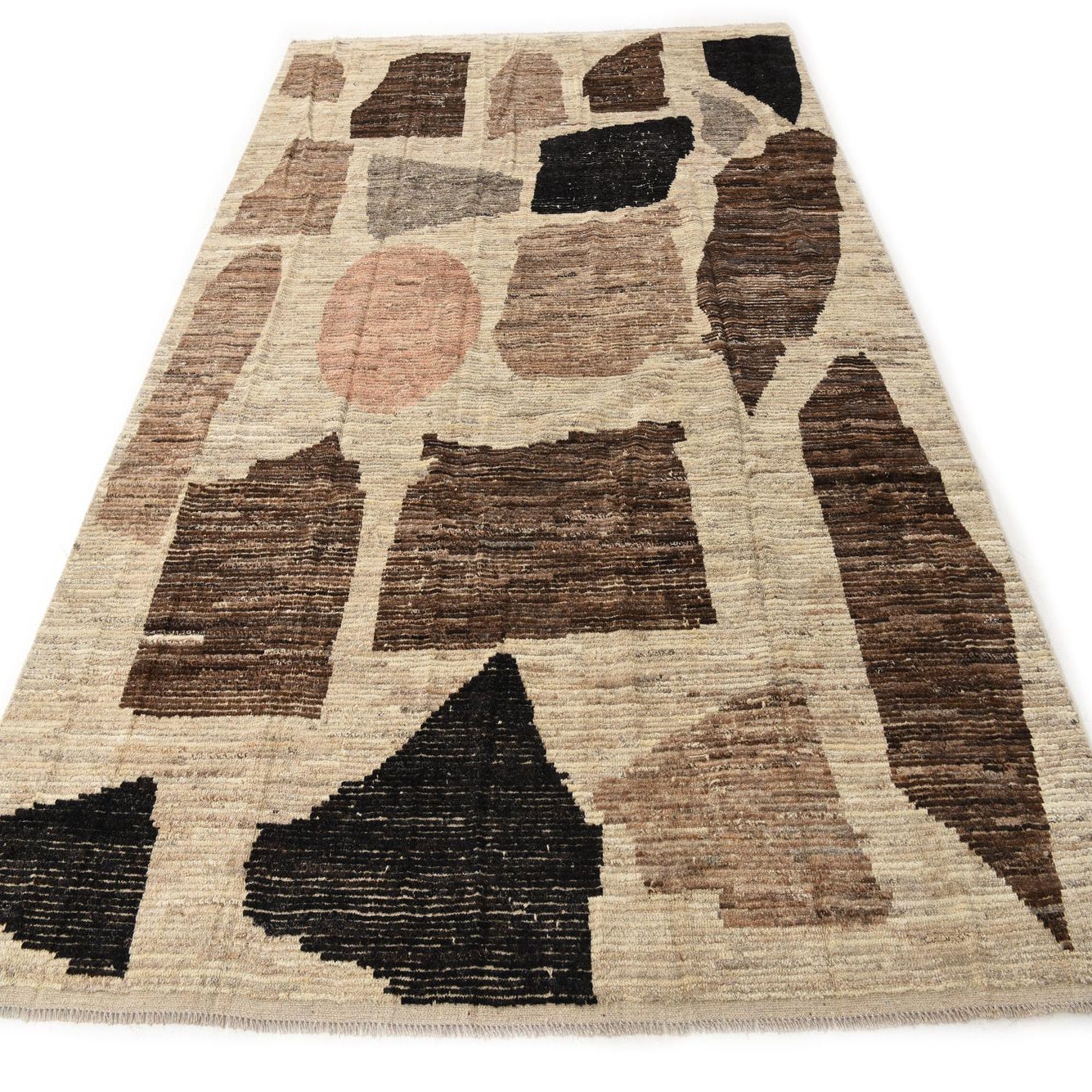 This Moroccan collection rug is an authentic Hand Knotted piece, crafted from 100% wool, measuring 8x11 feet. The rug showcases a modern interpretation of traditional Moroccan designs, featuring a beige background with an array of abstract patterns in black, gray, and light brown hues. The texture of the wool is evident in the pile, adding depth and tactile appeal to the piece.