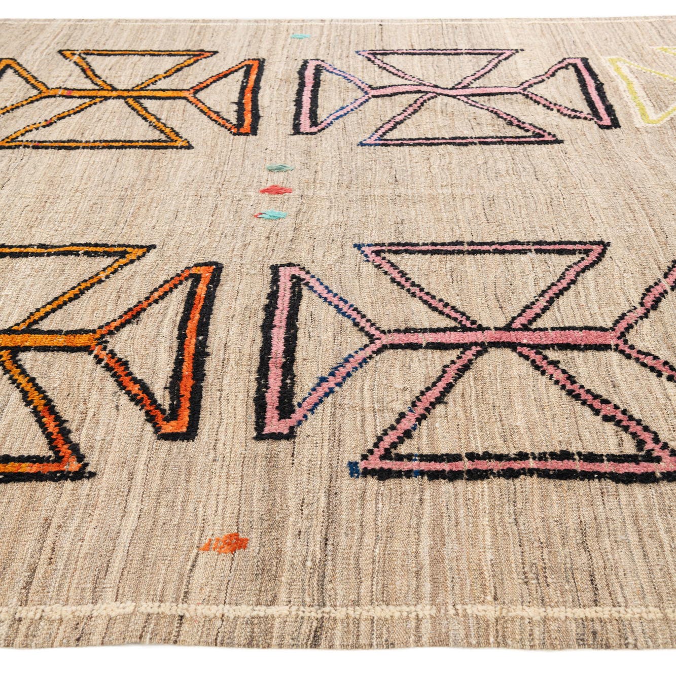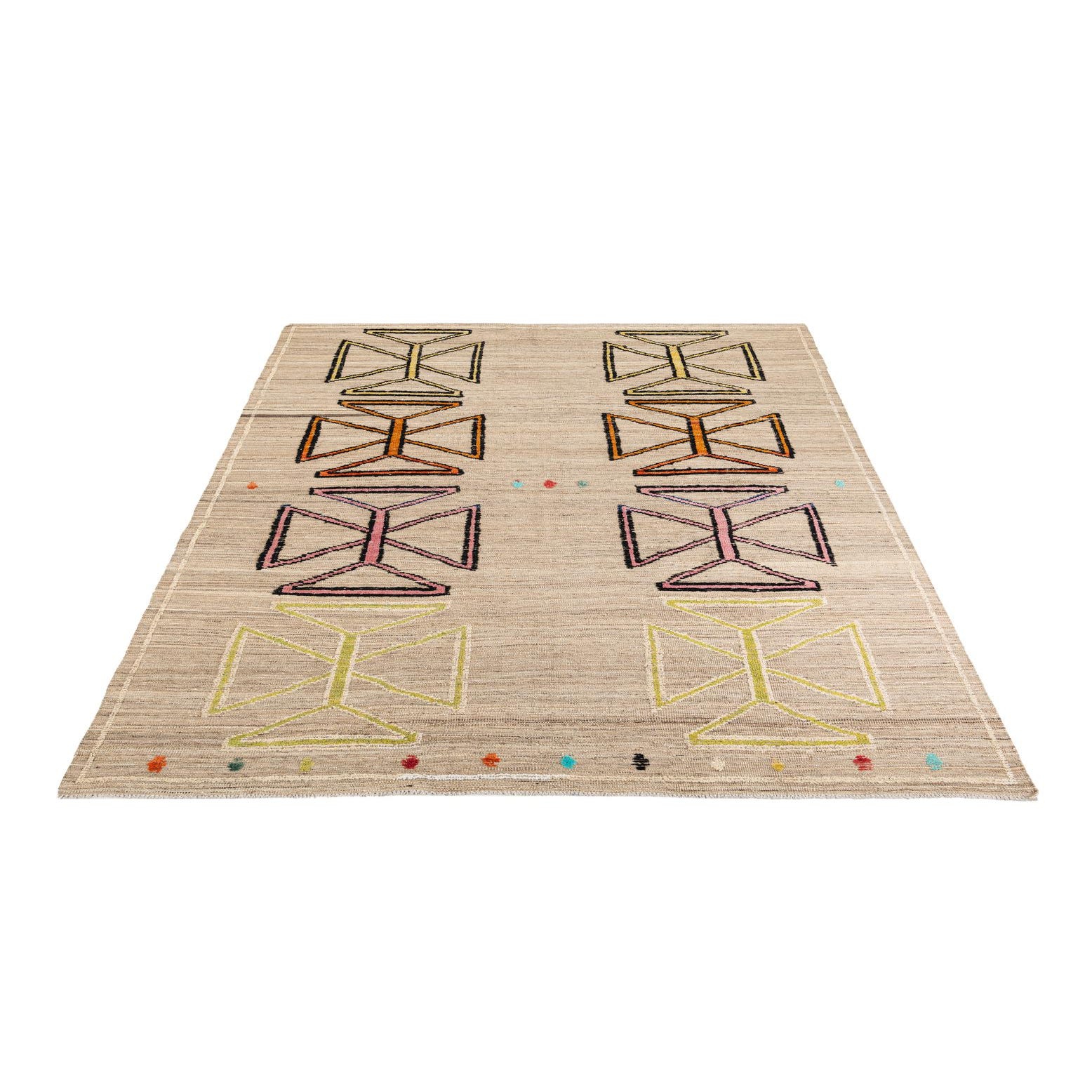 Primary color is Beige. Colors in this rug include: Beige, Black, Orange, Yellow, Pink, Light Blue, Light Green, Ivory.