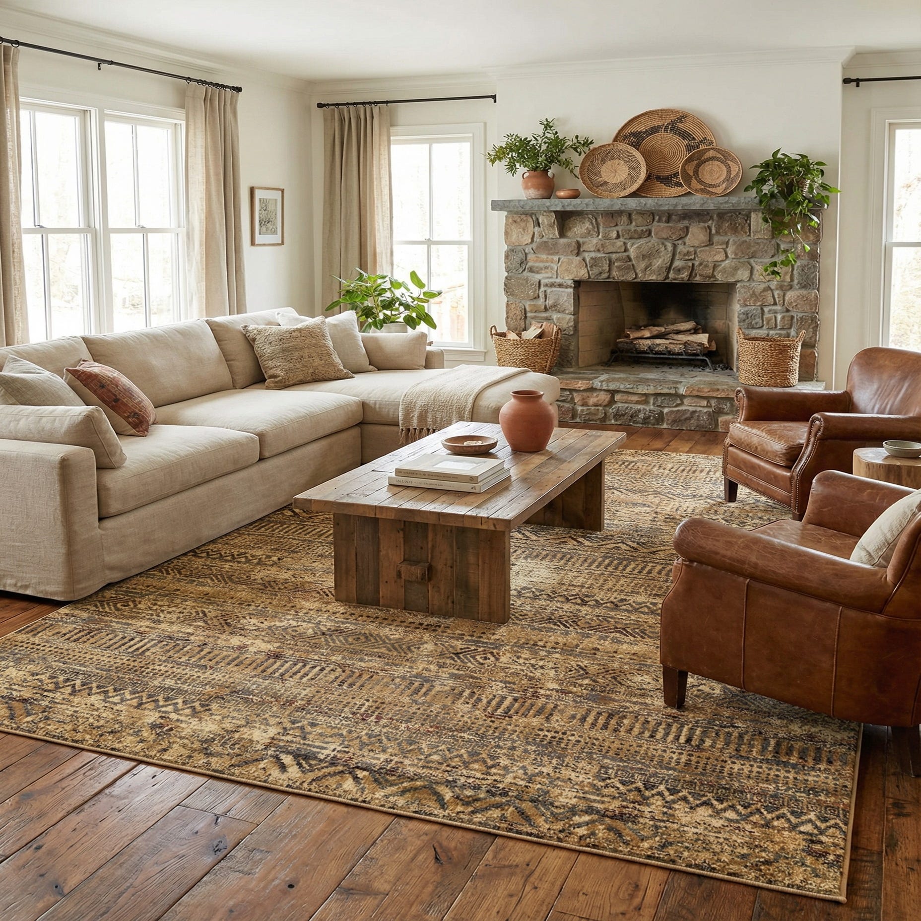 Woven in polypropylene, the rug has a low-profile pile that feels smooth underfoot with subtle surface texture where the pattern registers. It anchors a seating area nicely beneath a sofa and coffee table, fits well under a dining table in an open-plan room, or warms a home office on hardwood floors. Pair it with warm wood furniture, industrial metal accents, or neutral upholstery; olive or charcoal textiles and simple matte-finish accessories will echo the rug’s accent tones and complete the space.