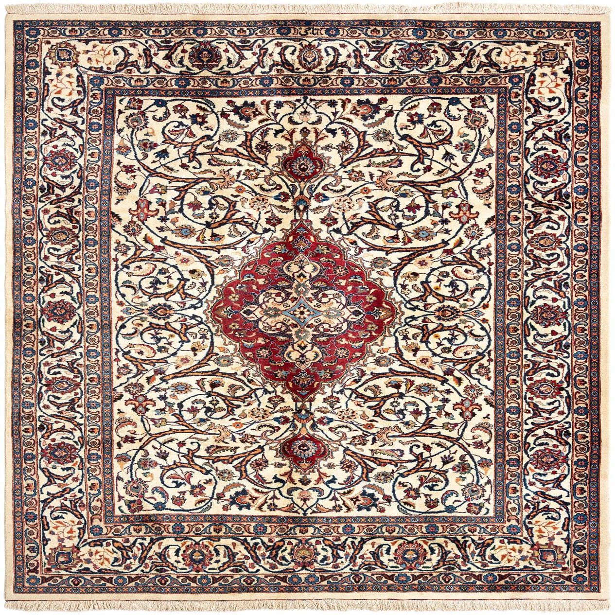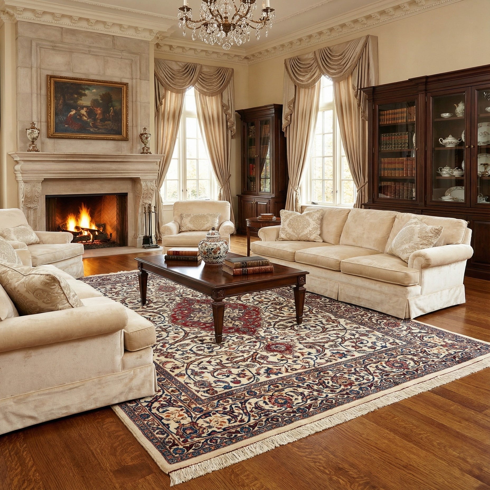 An 8x11 rectangular Persian rug with a cream background, intricate floral motifs, and a central red medallion.