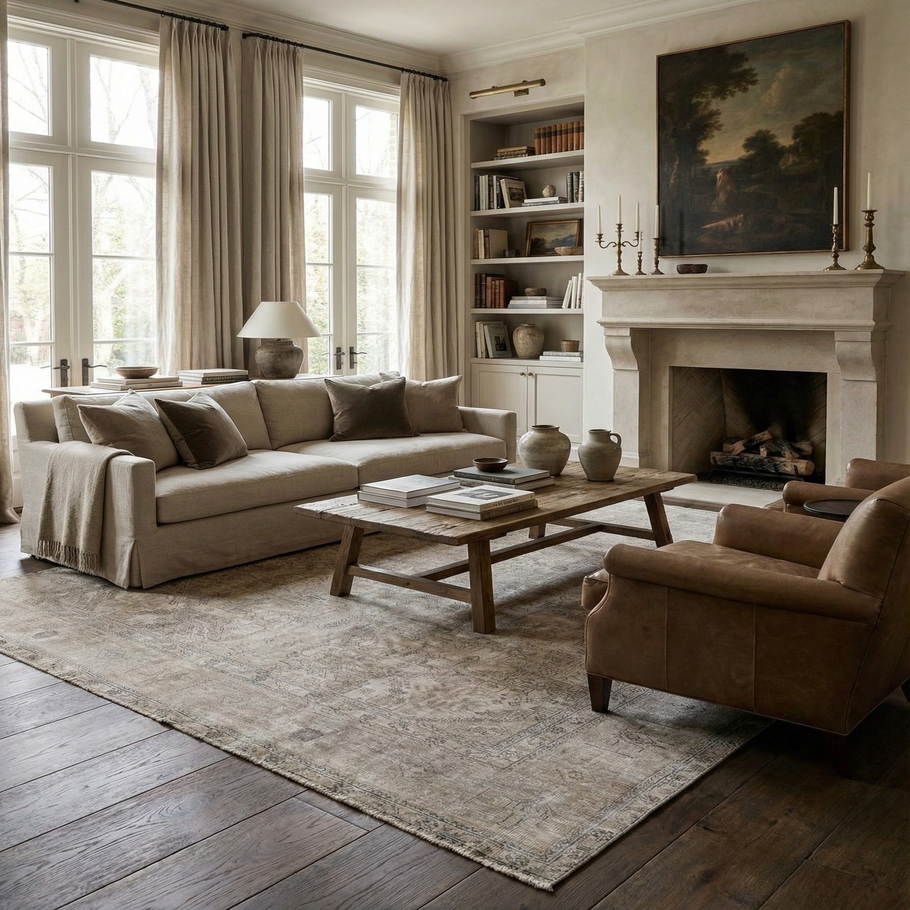 The wool pile feels dense and naturally resilient underfoot, with a subtle luster and slight irregularities that reflect its hand-knotted construction. Its neutral palette and understated pattern work well as an anchor for a seating area in a living room, layered beneath a natural-wood dining table, or placed in a bedroom to add quiet texture. Pair it with warm woods, leather accents, and soft linens for a relaxed transitional setting, or use it to soften clean-lined modern furnishings.