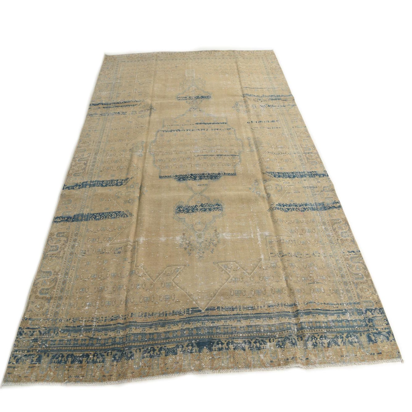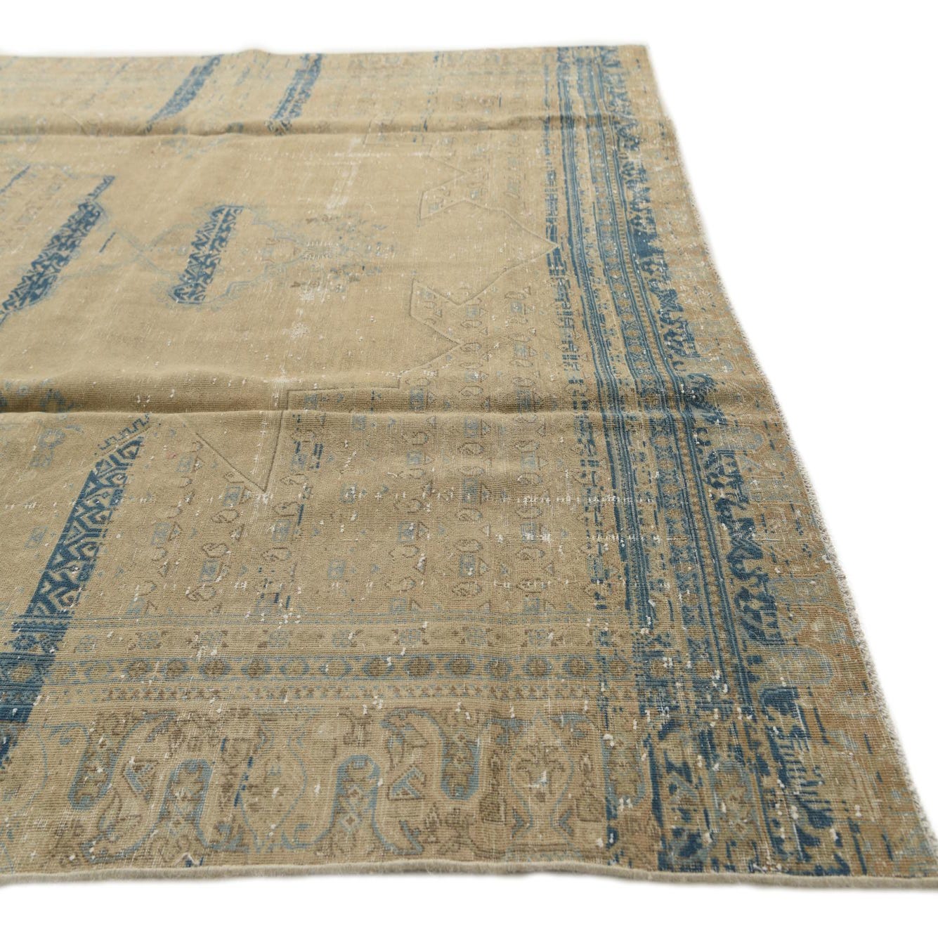 Hand-knotted in 100% wool, this vintage-style rug presents a softly distressed central medallion set against a warm beige field. Faded blues and navy blue line the medallion and repeat in the surrounding border, while touches of brown add depth to the overall palette. The pattern balances geometric and floral motifs with an intentionally worn finish that gives the surface a lived-in, layered look. Underfoot the wool feels dense yet soft, with a low-to-medium pile that lays flat and reveals subtle variation from the hand-knotted construction.