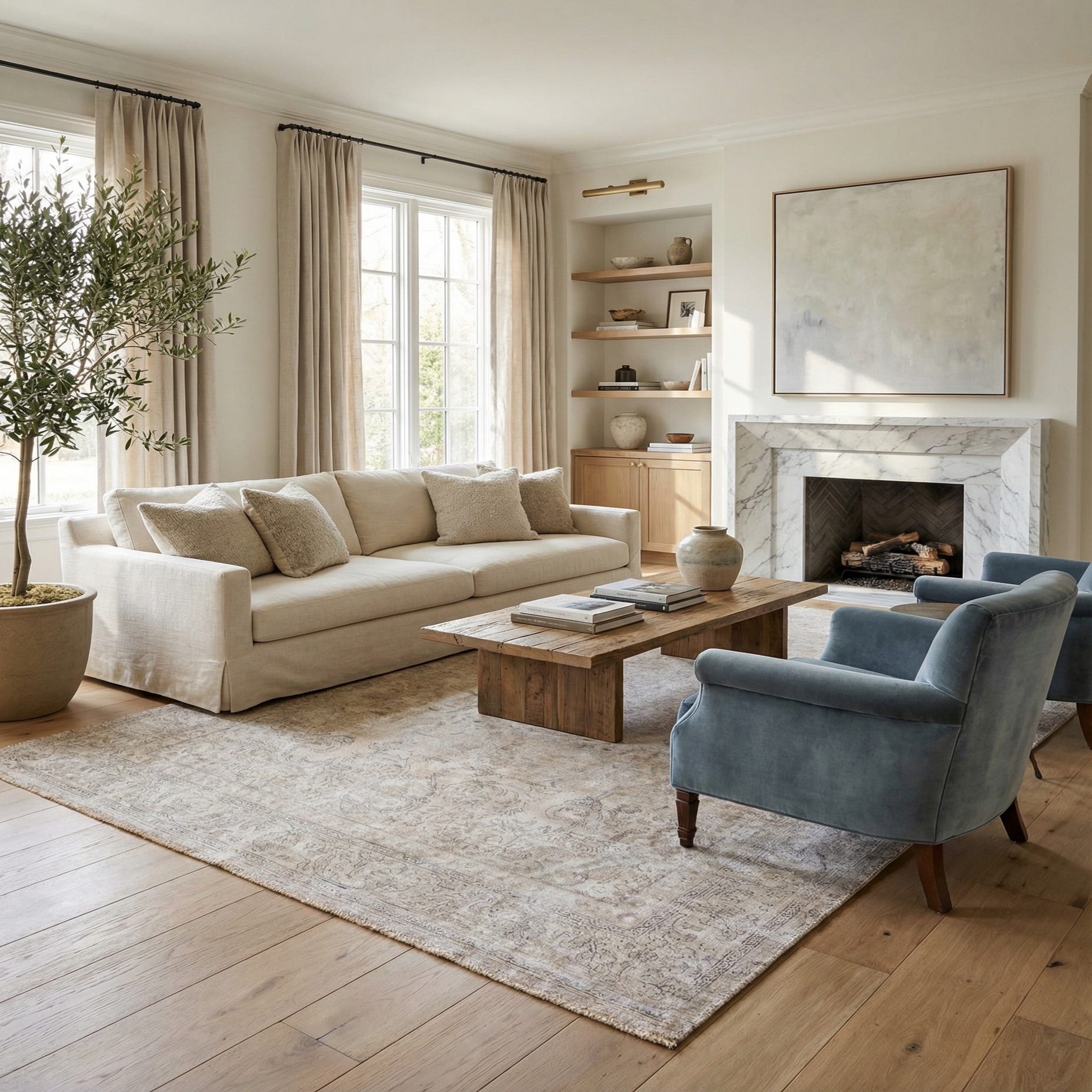With its neutral color palette and refined design, this rug can seamlessly integrate into a range of interior styles from modern minimalist to more classic and traditional decors. It can act as an anchor for a living room, providing a tasteful foundation for furniture in solid colors or subtle patterns. In a dining area, it can offer a soft, textural contrast to wooden tables and chairs while complementing the room's existing elements. Its versatile pattern and hues also make it suitable for a professional office, where it can add warmth and sophistication without overpowering the space.