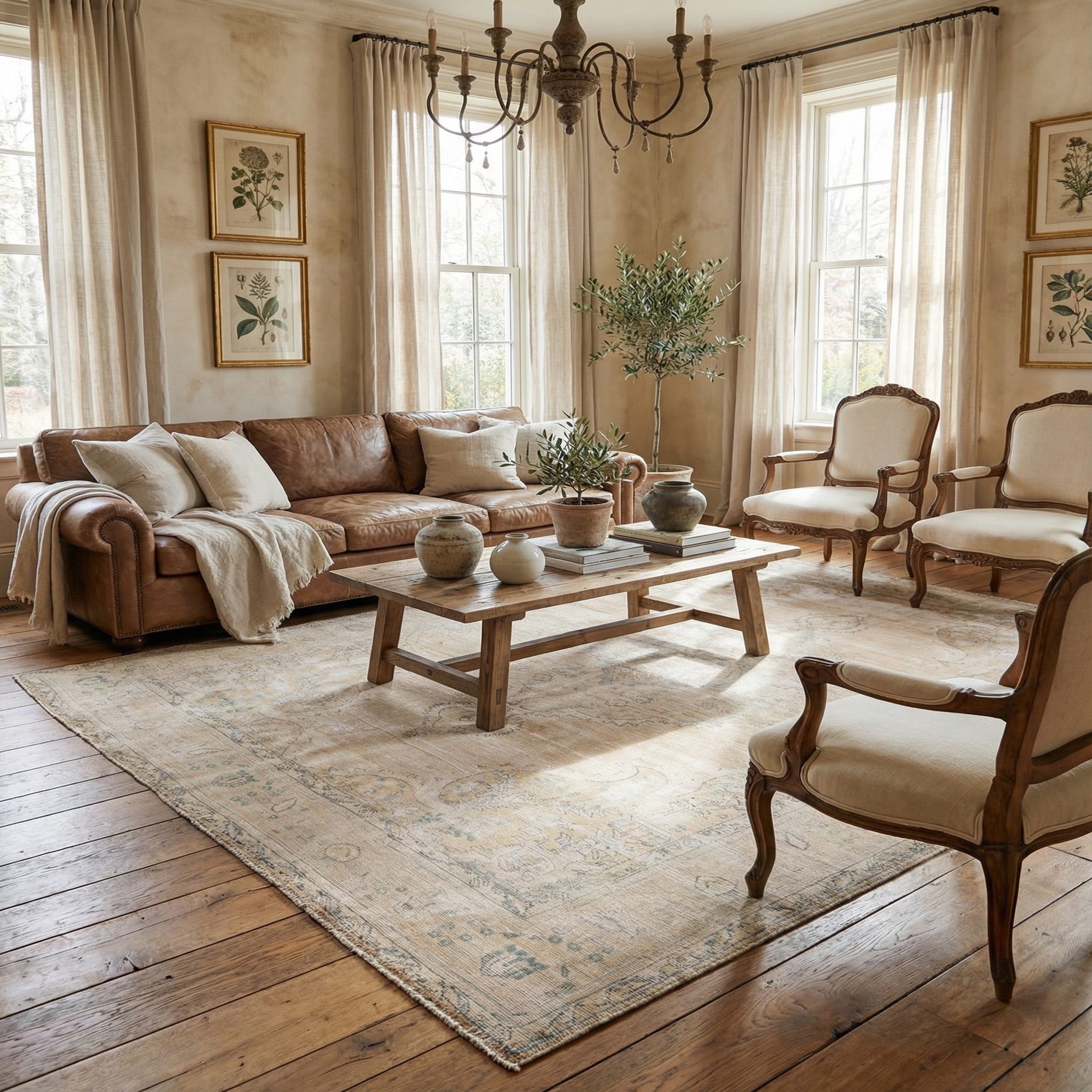 An 8x11 rectangular Ultra Vintage wool rug in shades of brown, tan, and cream, featuring a faded Persian-style medallion and border.