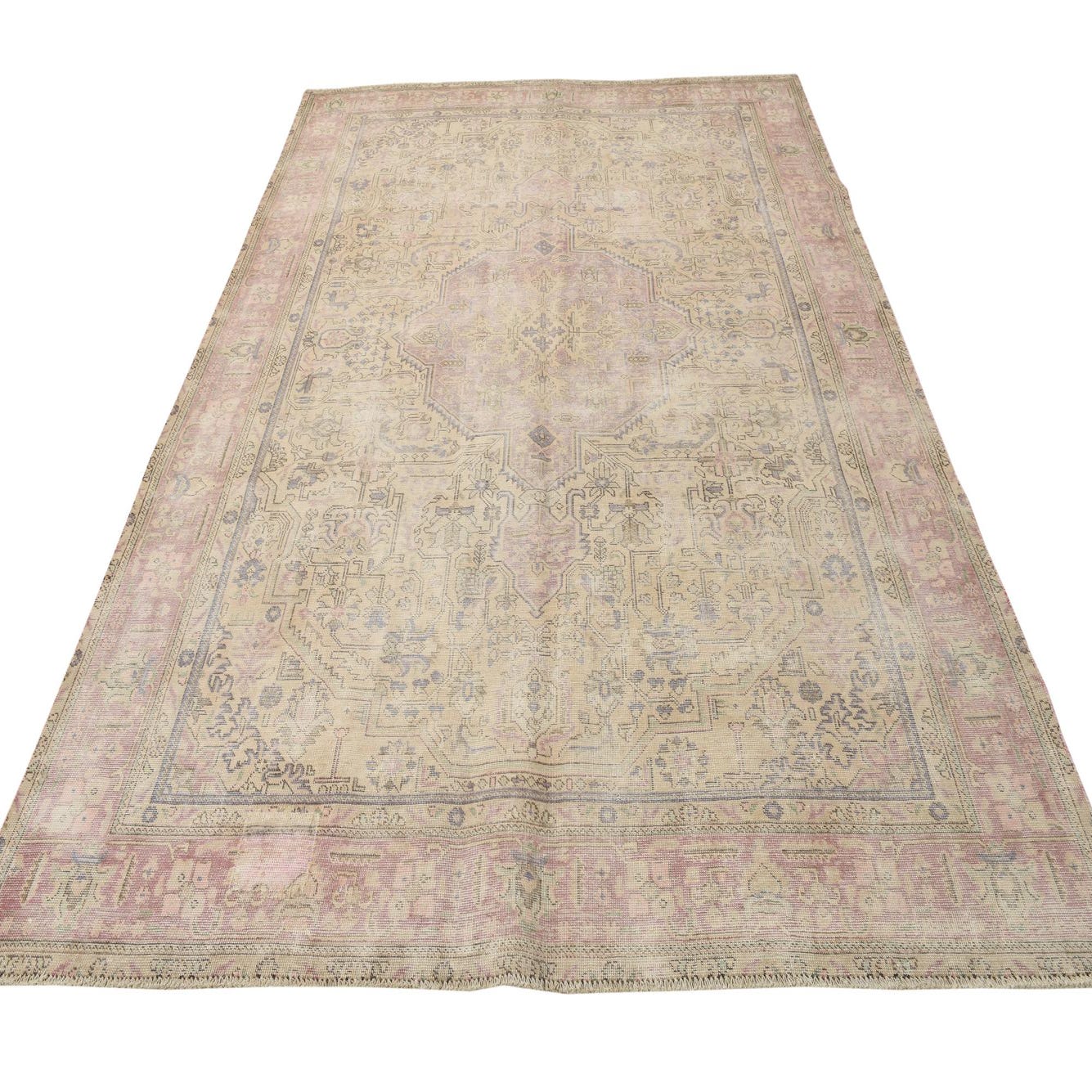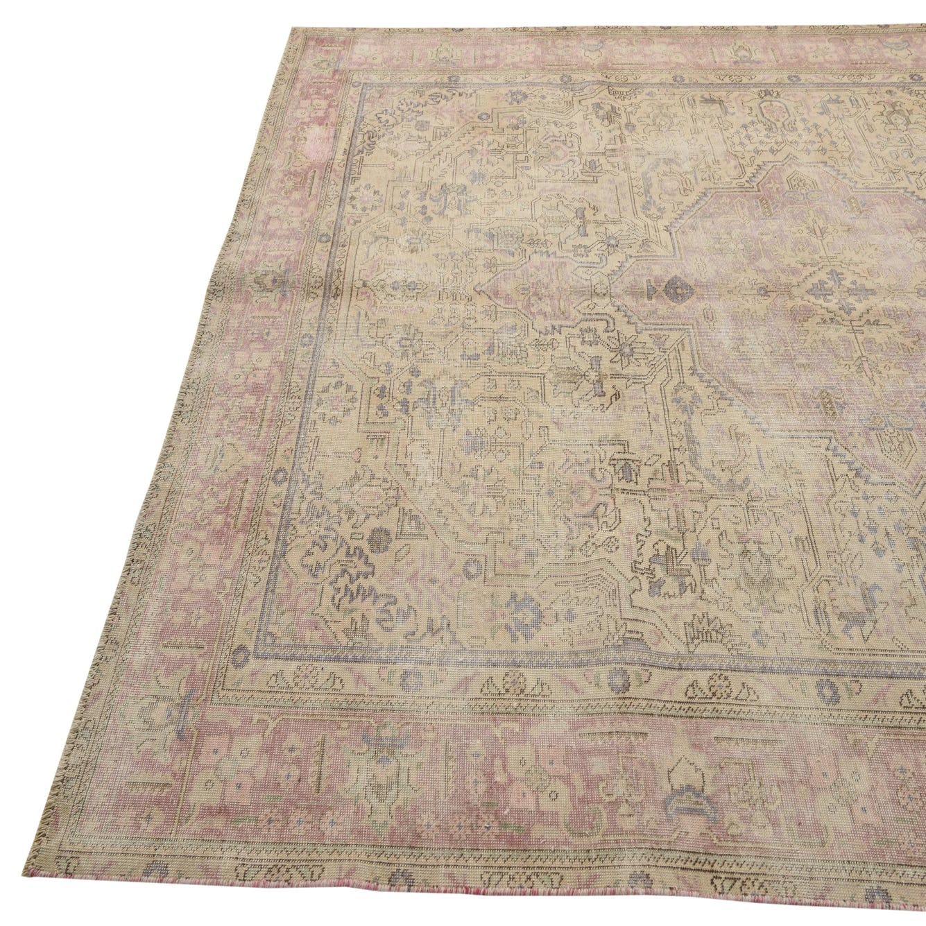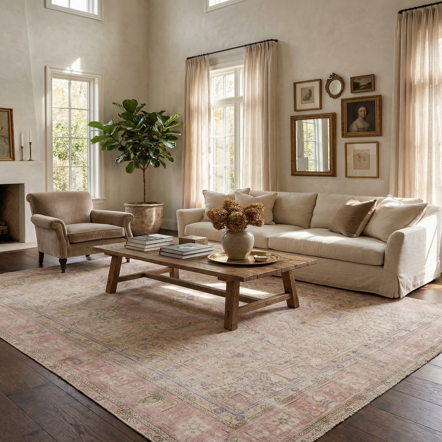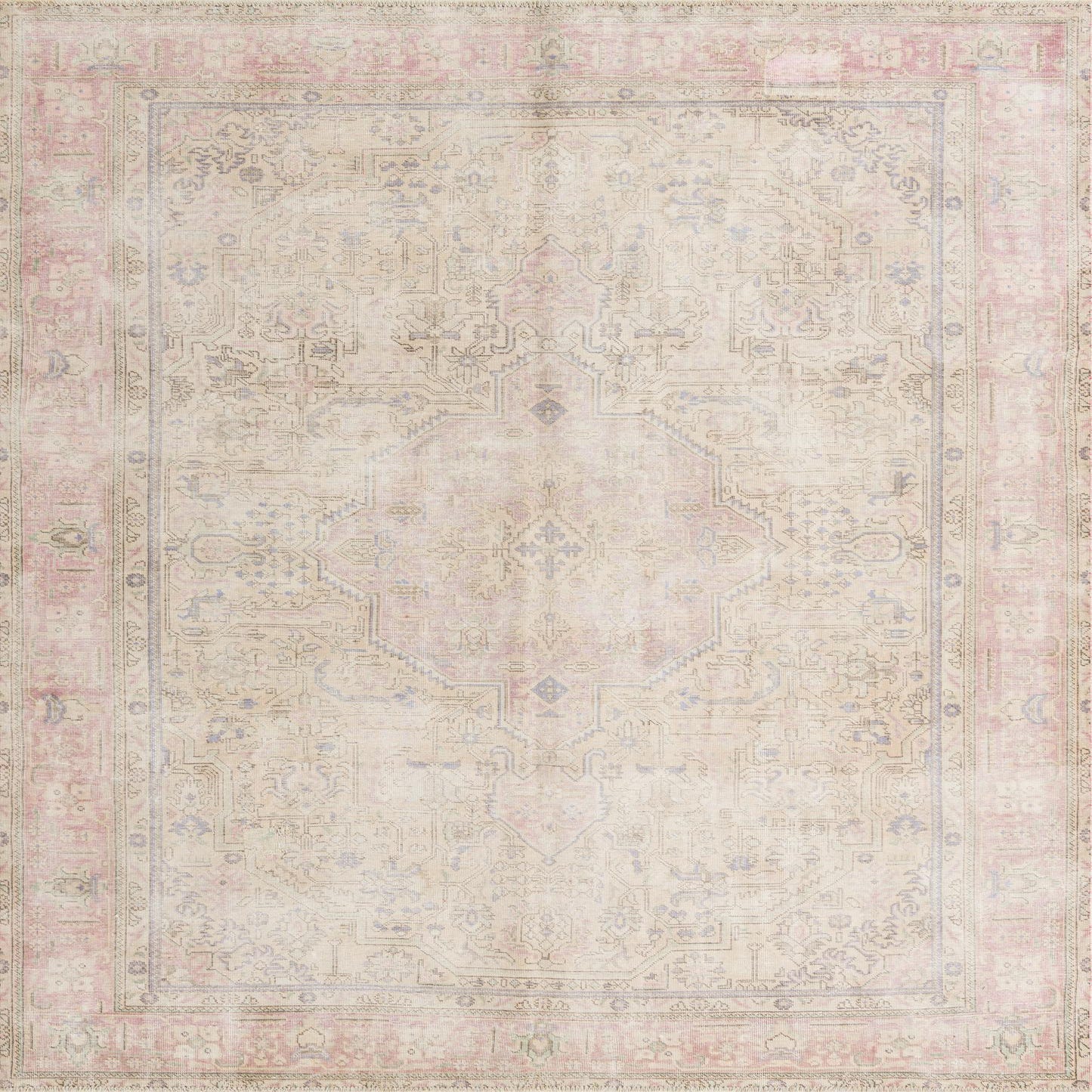 An 8x11 rectangular indoor rug with a faded Persian medallion pattern in browns, tans, creams, and subtle pinks.