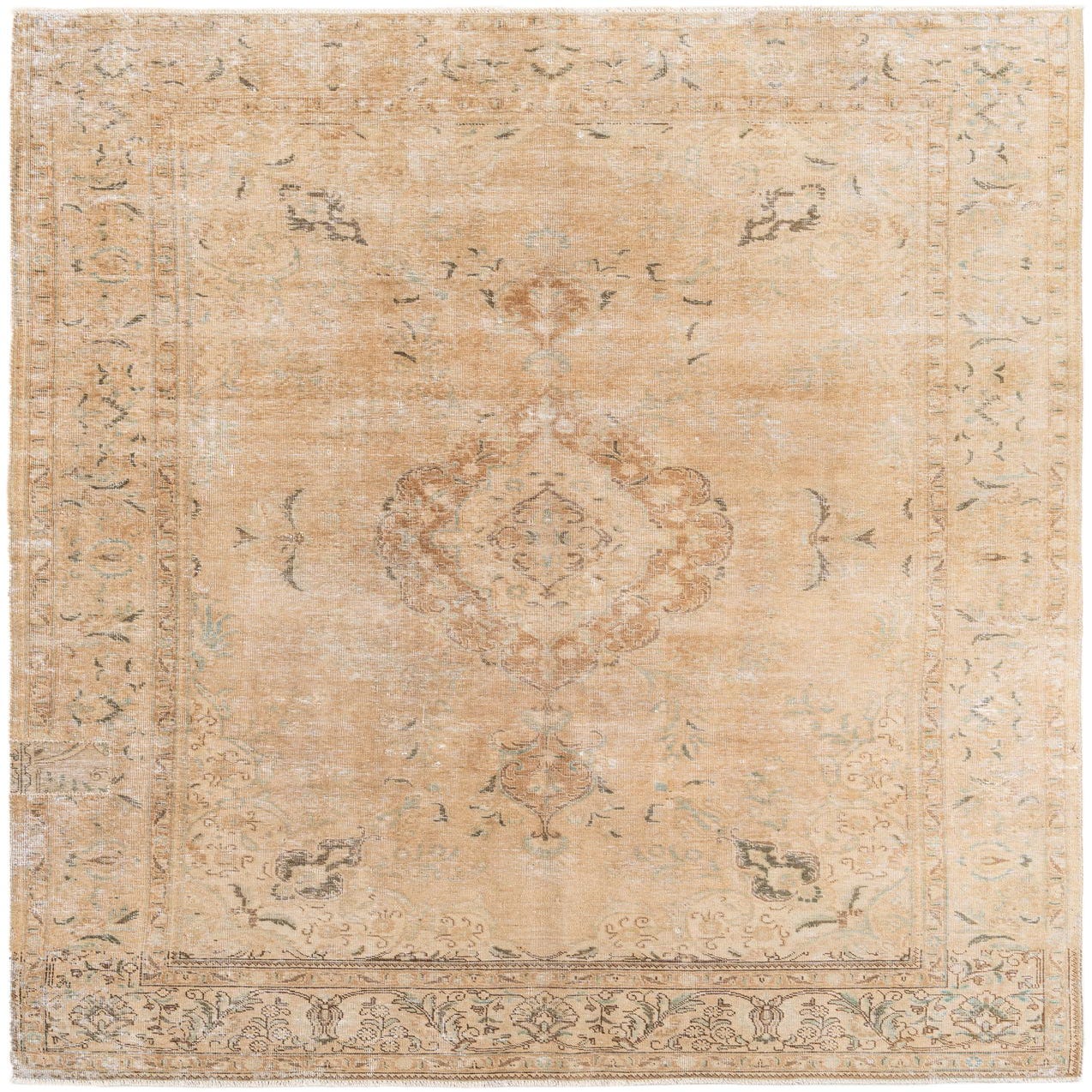 A soft beige field provides a calm backdrop for a faded medallion and delicate floral motifs worked in warm brown and touches of muted blue. The overall look is vintage-inspired with intentional distressing that lets the pattern read as gentle, worn-on-time ornament rather than a bold graphic. Hand-knotted of 100% wool, the pile has a low, velvety texture with subtle variations in knotting and finish that give the surface an inviting, tactile quality.
