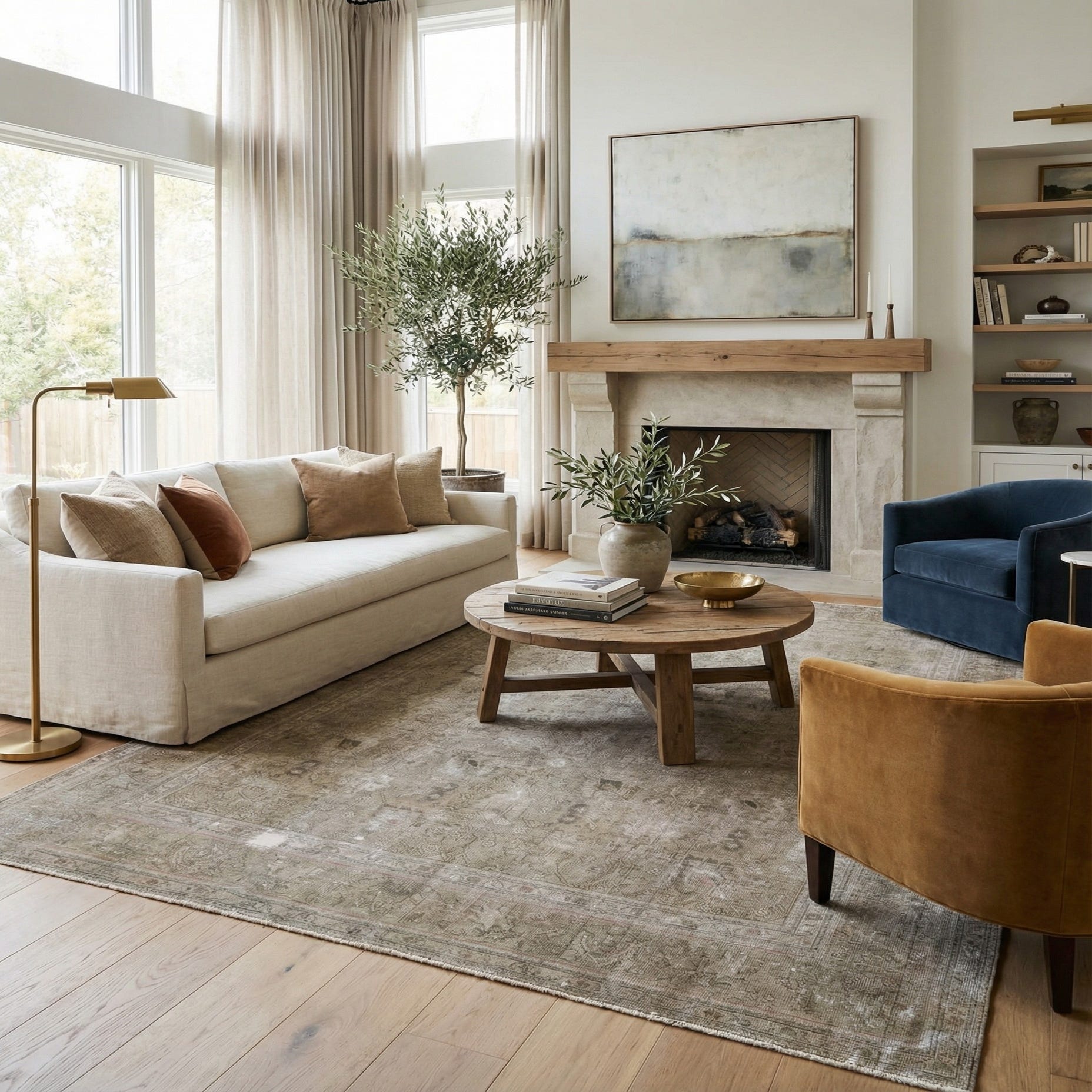 A rectangular 8x11 Ultra Vintage wool rug in shades of brown and tan, featuring a faded Persian medallion pattern, ideal for a living room.
