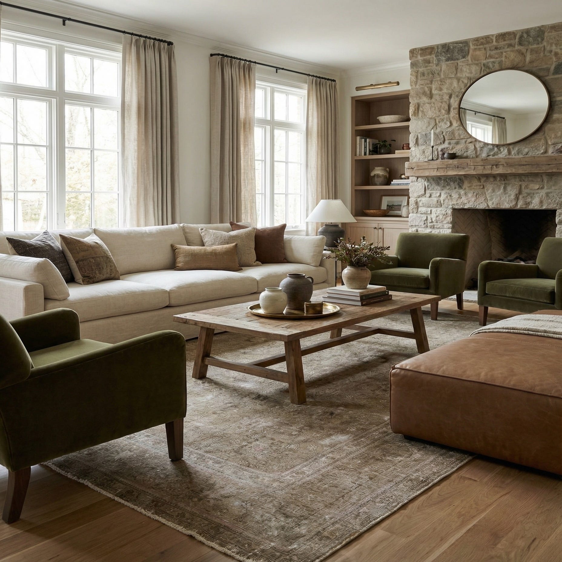 Primary color is Beige. Colors in this rug include: Beige, Brown, Olive.