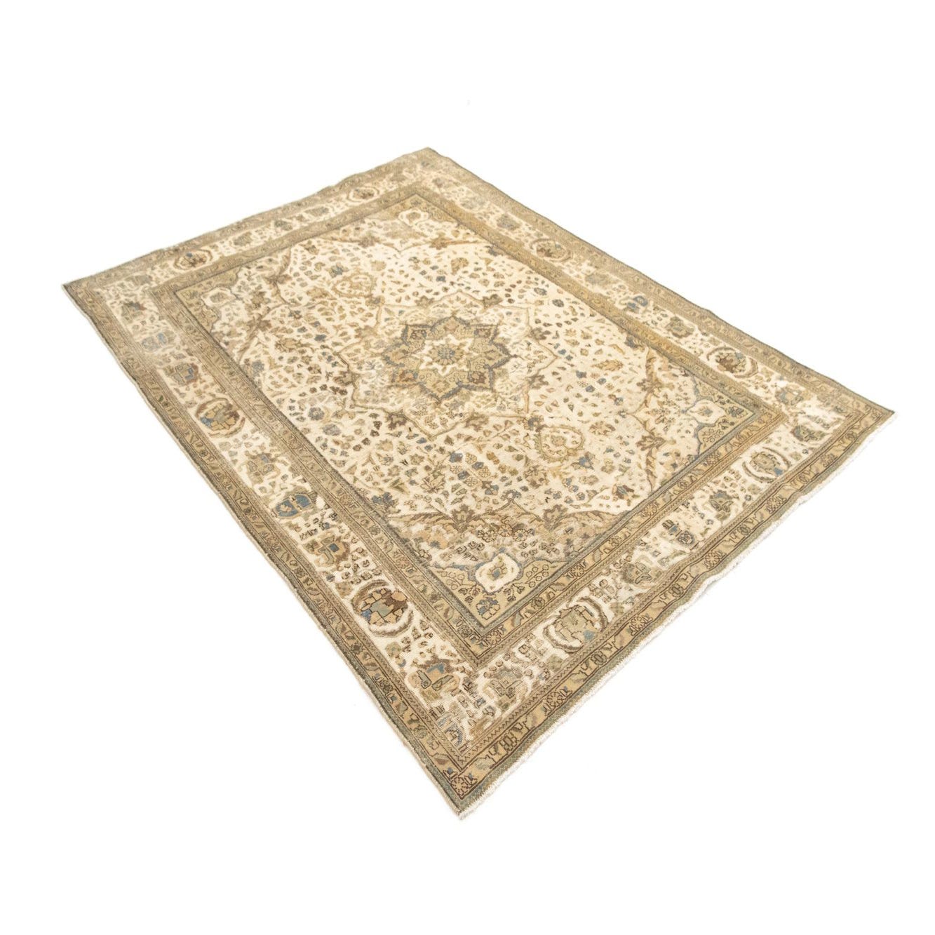 This rug would integrate seamlessly into interiors that value a sophisticated atmosphere. Its neutral yet nuanced color scheme allows it to be a versatile addition to traditional settings, such as living rooms with classic wood furniture or dining spaces that feature heirloom pieces. It is equally adept at adding a touch of timeless elegance to more contemporary spaces that favor a mix of old and new elements. Its substantial size makes it an excellent choice for anchoring seating arrangements or creating a distinguished area within an open-plan room.