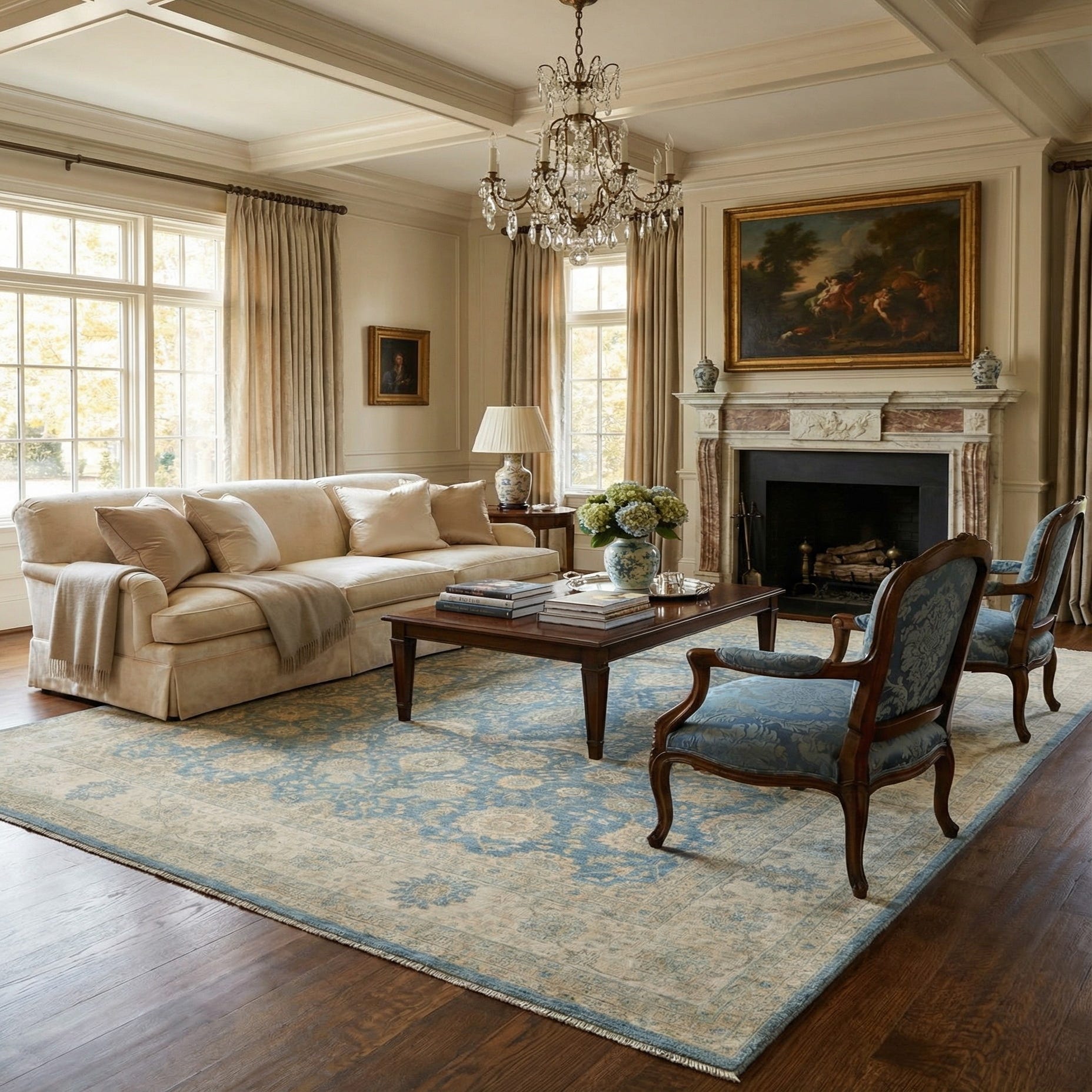 A rectangular 8x11 Ziegler Persian rug with a light blue field and cream floral patterns, bordered by a cream frame with complementary designs.