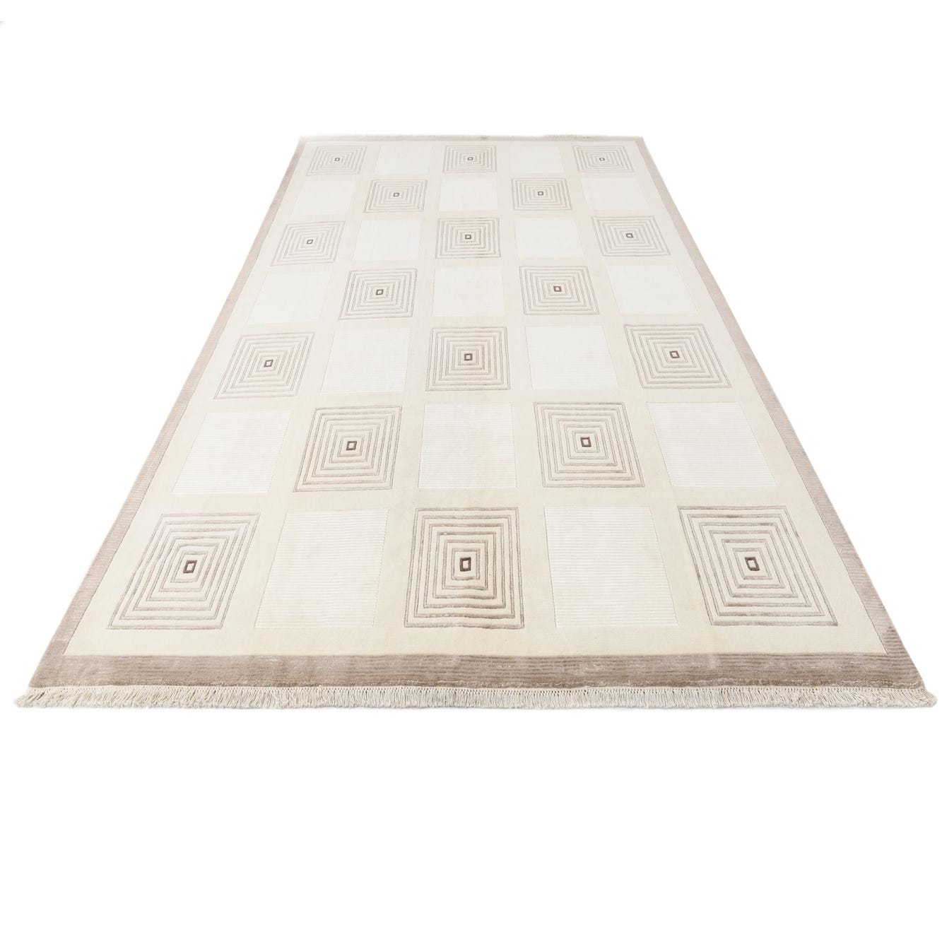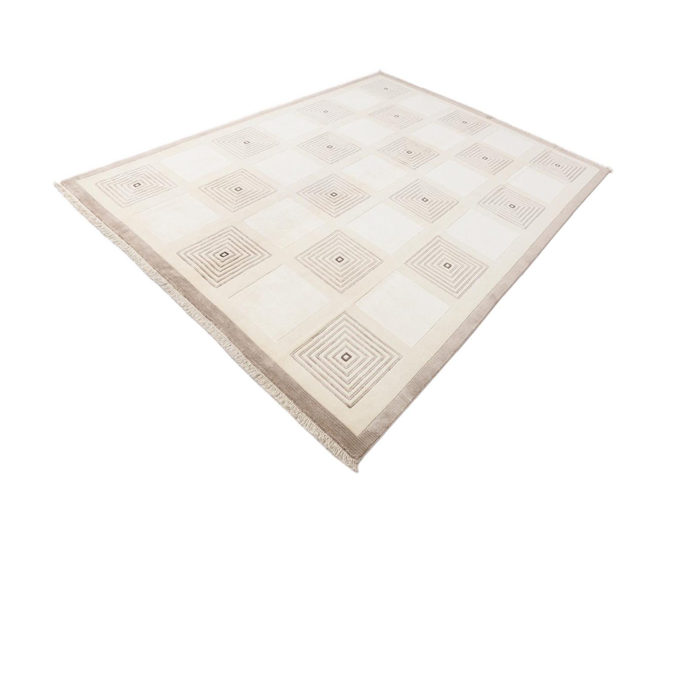 This Darya collection rug presents a minimalist geometric design that works to anchor any space with its composed and orderly pattern. The rug showcases an array of concentric diamond motifs housed within square frameworks, arranged in a balanced grid across its 8x12 surface. The color palette is a harmonious mix of beige, brown, tan, and light brown, set against a primarily beige background. The subtlety of hues conveys a refined and sophisticated look, highlighting the precision of its hand-knotted construction. Made from 100% wool, the rug ensures a soft, plush texture underfoot.
