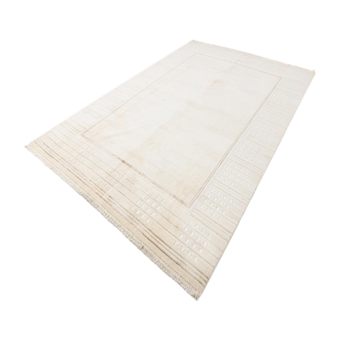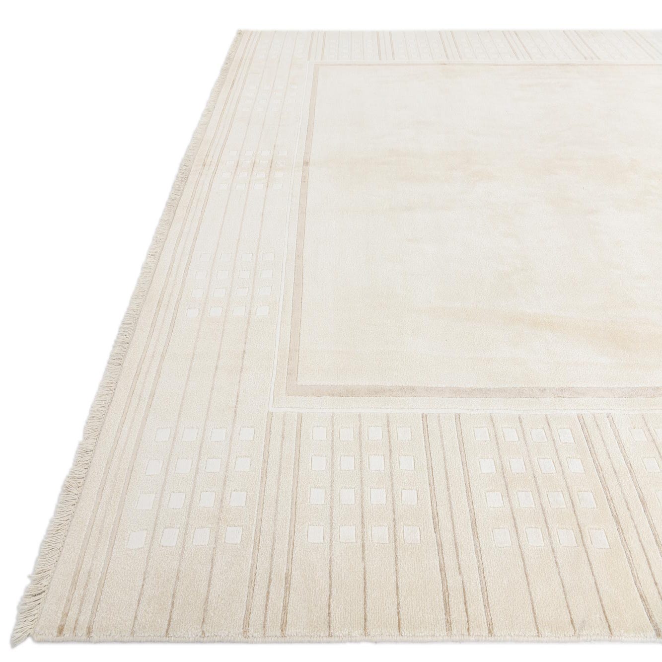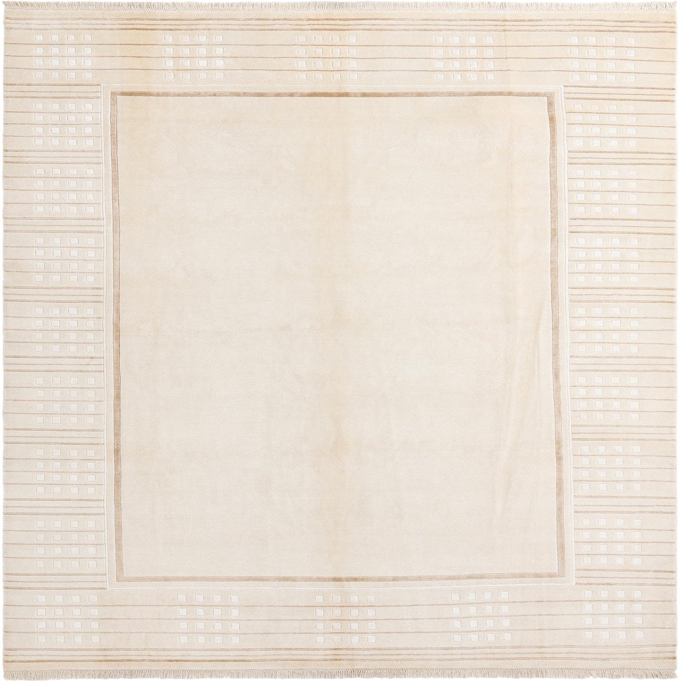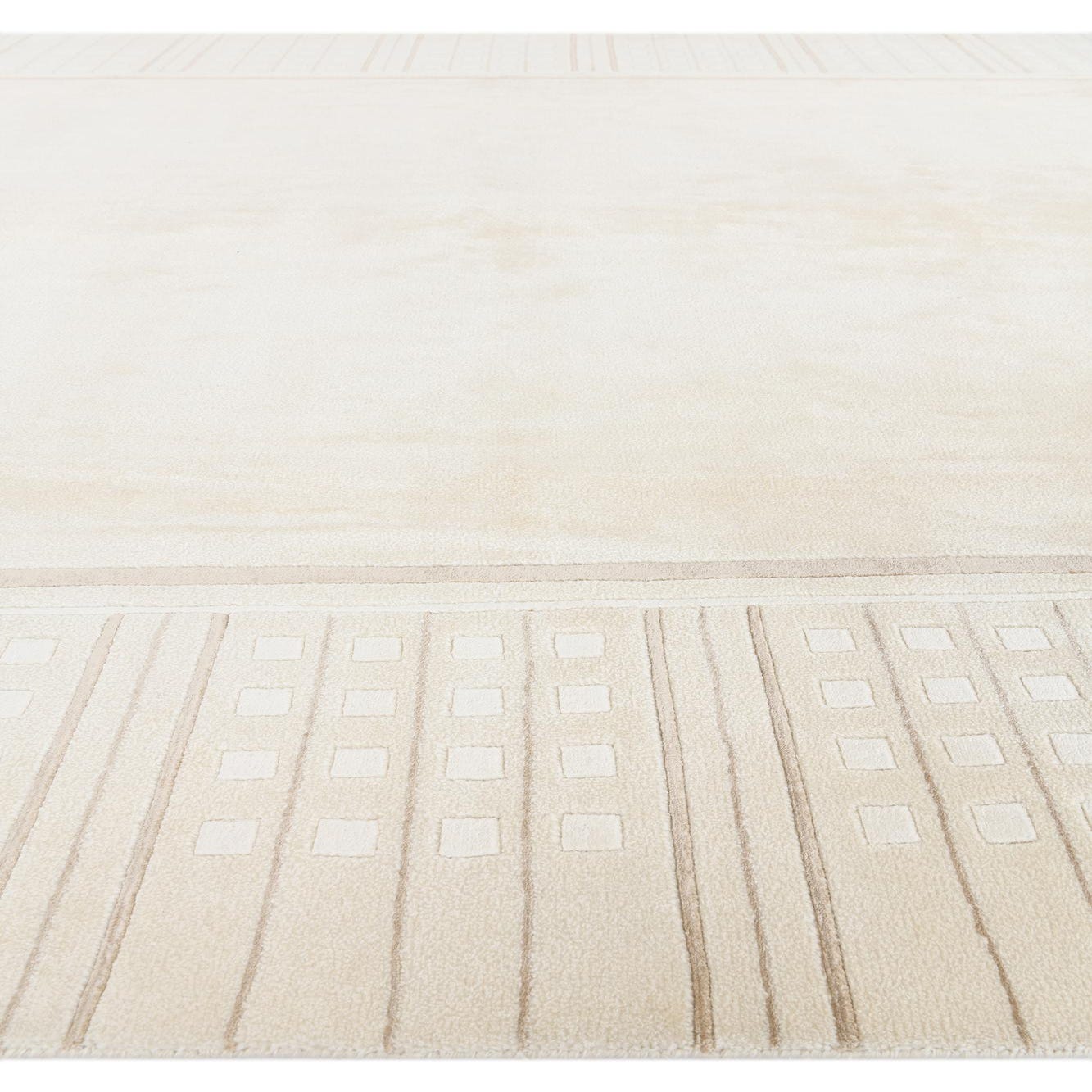 The pattern comprises a serene beige background color, complemented by tan, ivory, and light brown detailing. This muted color scheme provides a versatile foundation for a variety of interior styles. The border is elegantly defined with linear accents and discreet rectilinear motifs that add visual interest without overwhelming the space.
