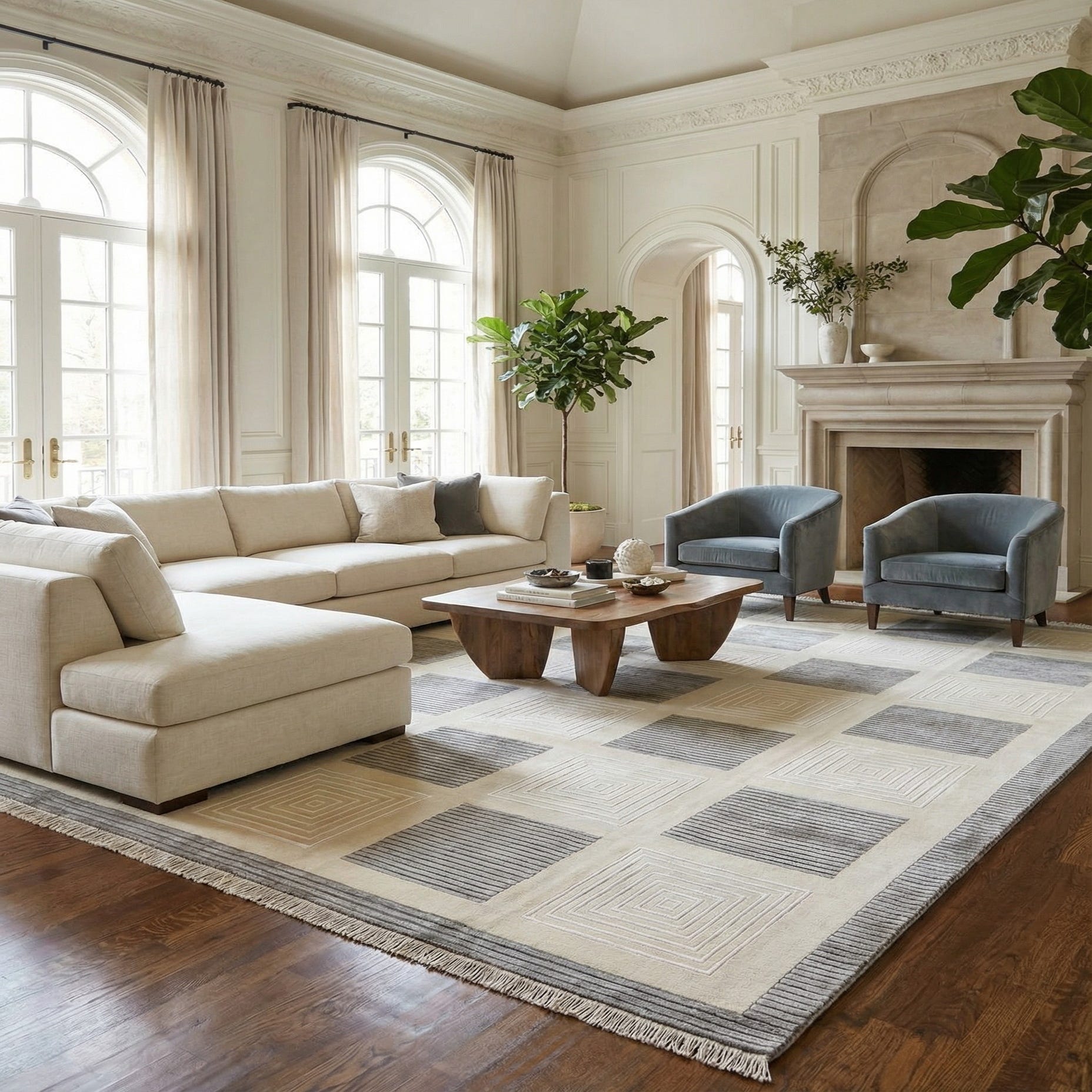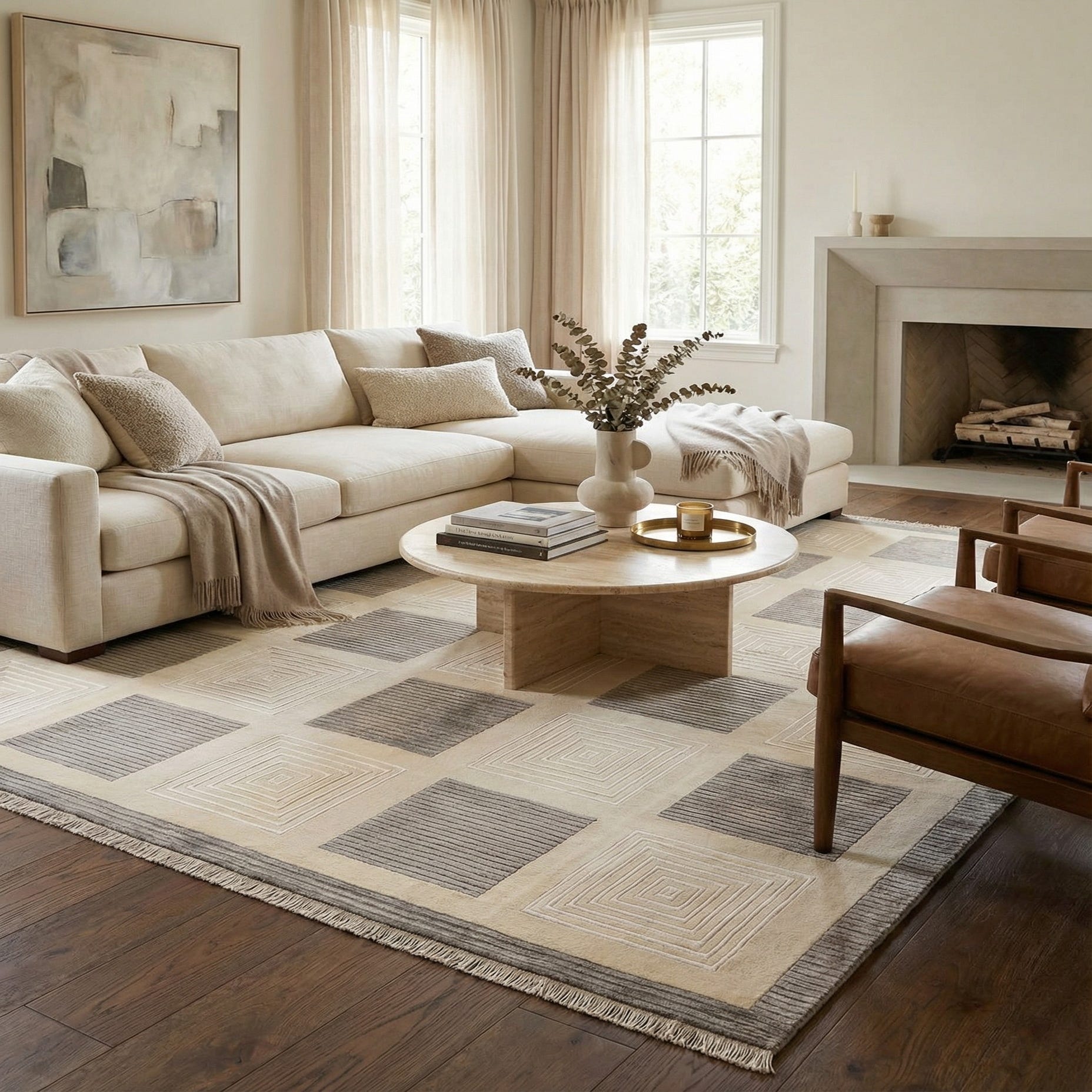 Given the rug's size and understated elegance, it is well-suited for a spacious living room, dining area, or open-concept space as a sophisticated anchor for furniture arrangements. In a minimalist or Scandinavian-inspired interior, the Darya rug's clean lines and soft coloration would harmonize seamlessly. Conversely, in an eclectic or transitional setting, the geometric pattern could serve as a contemporary counterpoint to more traditional elements, ensuring the rug's adaptability across various decor themes.