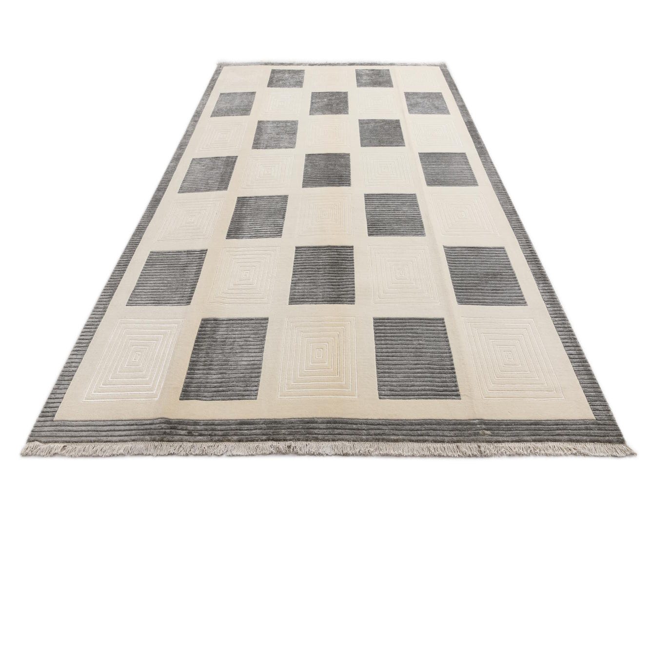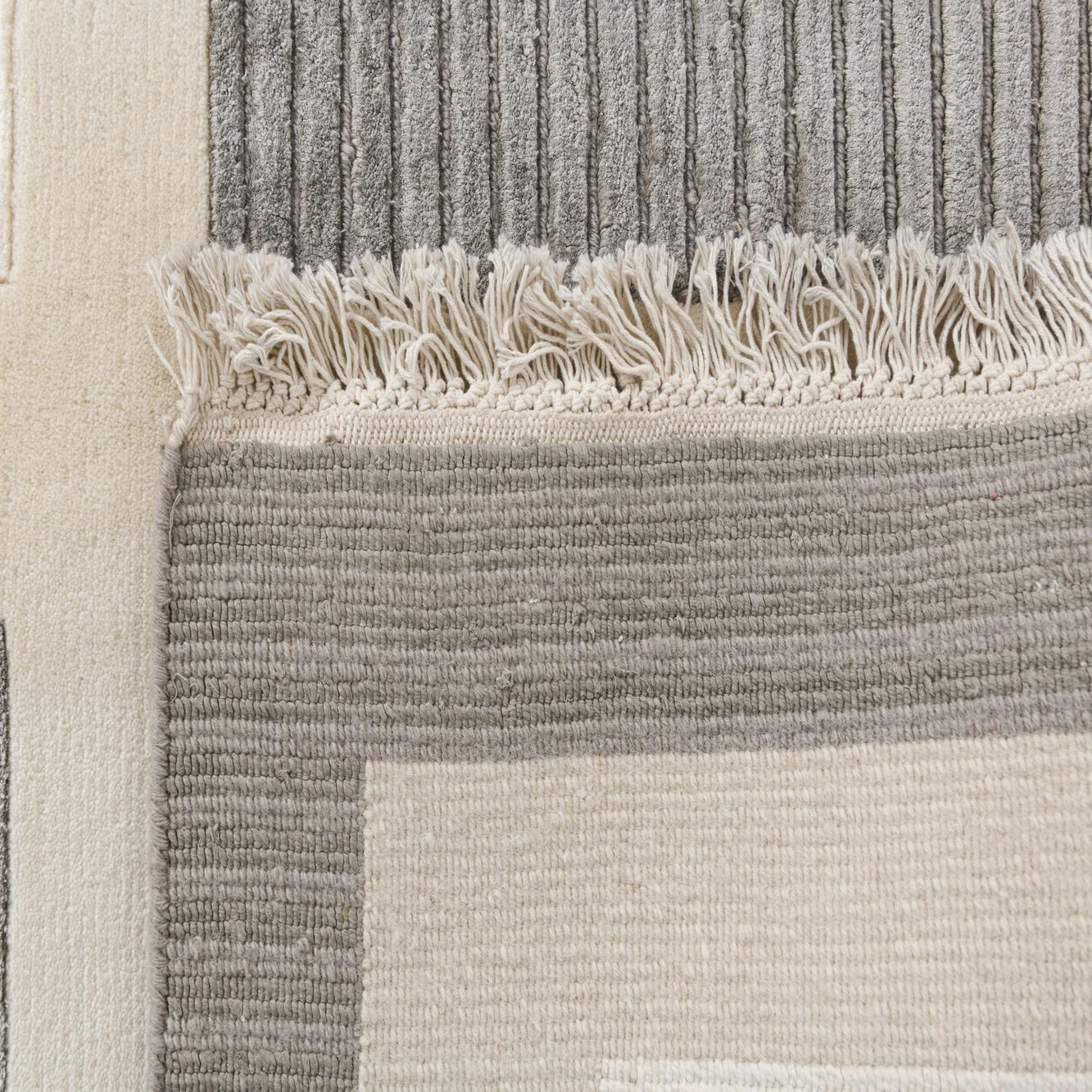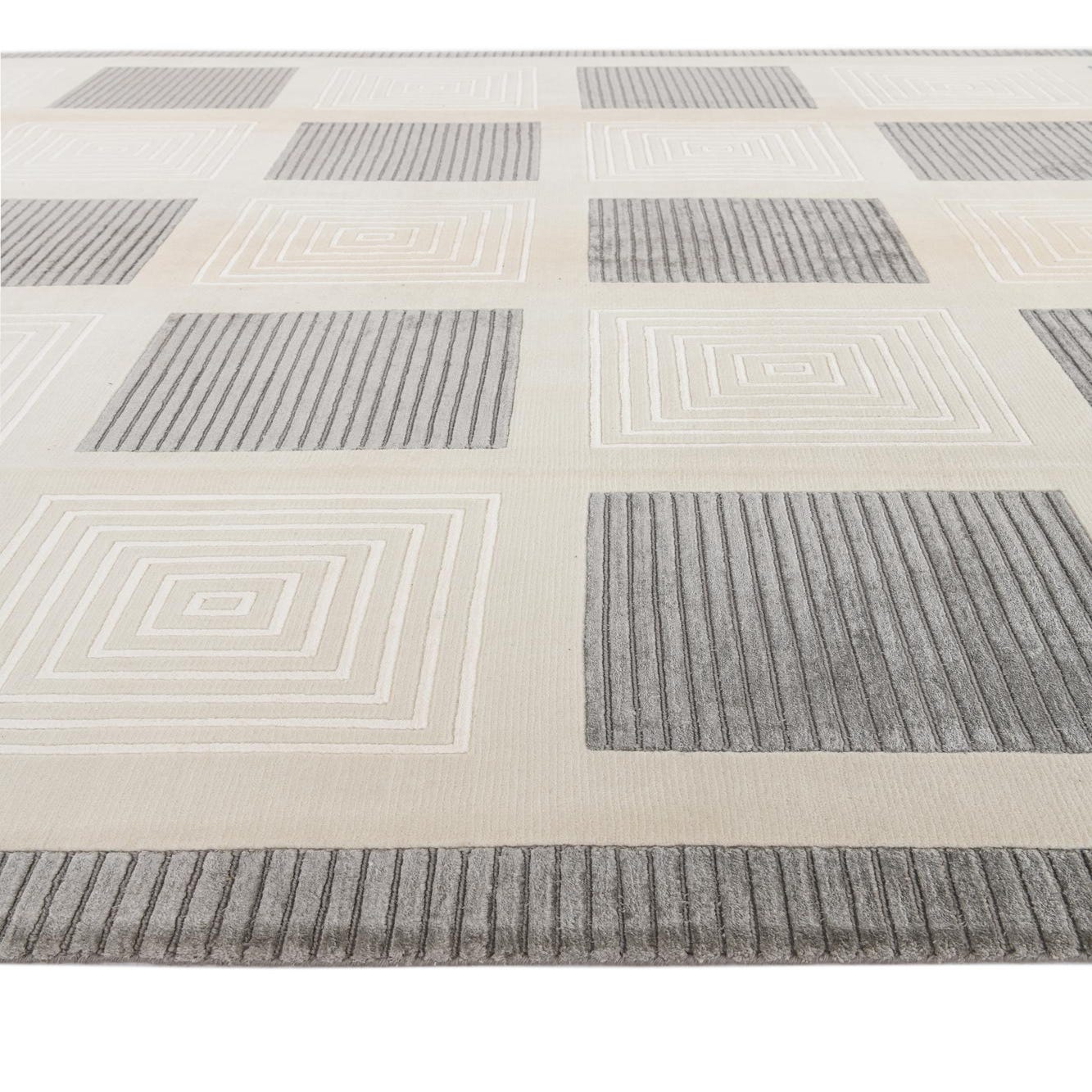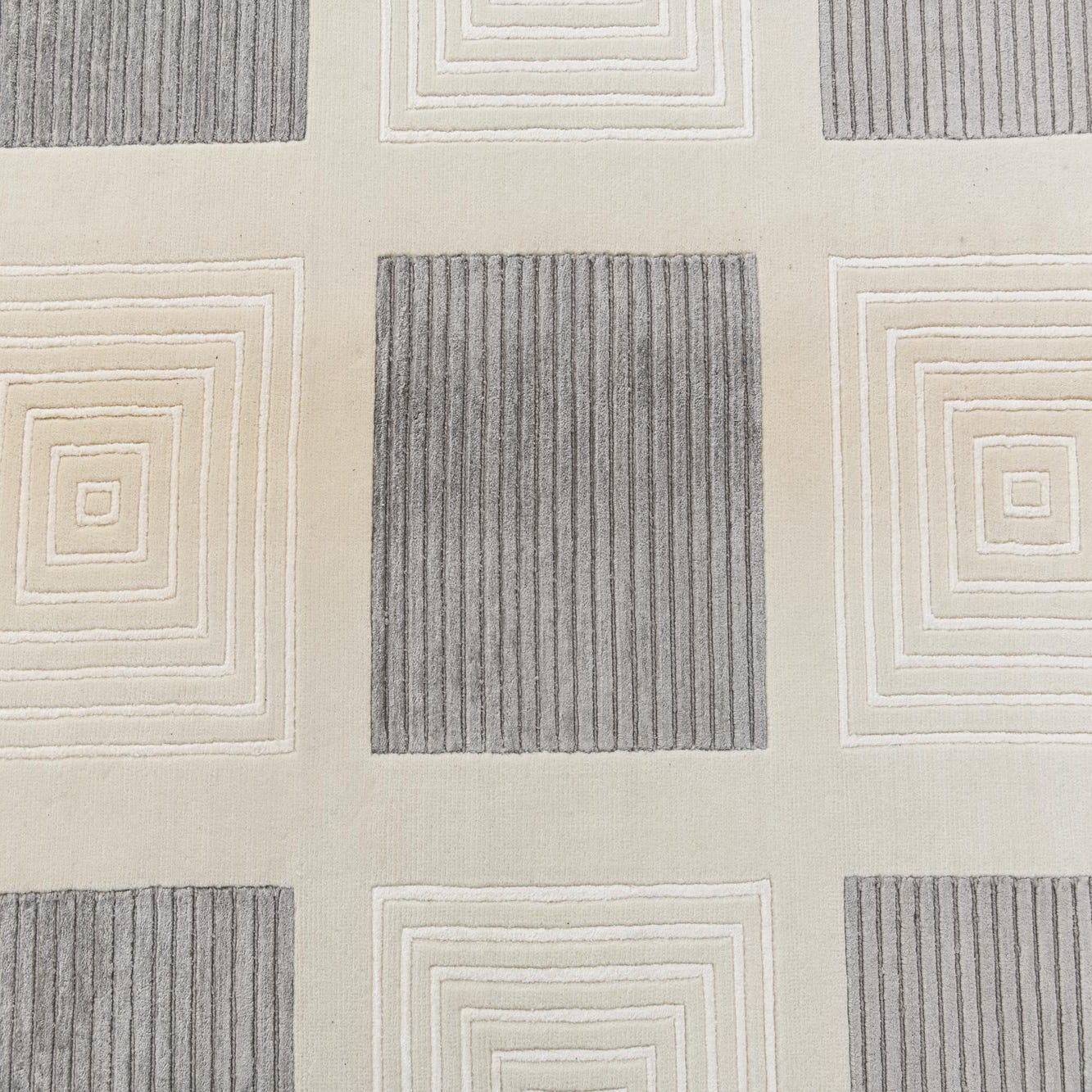 The Darya rug is hand-knotted from 100% wool, offering a balance of durability and luxurious tactility. This piece measures 8x12 feet and presents a captivating contemporary design. The pattern consists of an array of alternating square motifs, each featuring either a series of concentric squares or horizontal striations, creating a dynamic visual texture. The color palette is muted and refined, with beige, cream, and gray tones that establish a serene and versatile appearance. The background color of beige provides a warm and neutral foundation for the graphic elements.