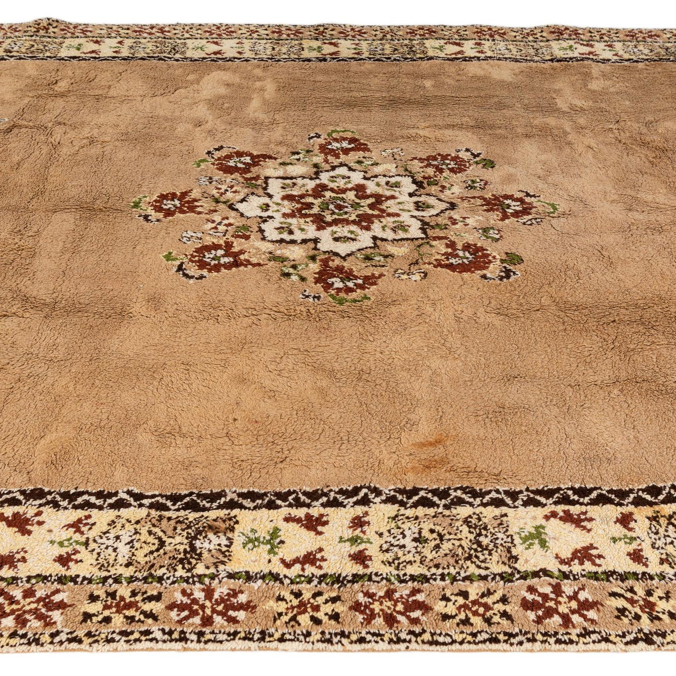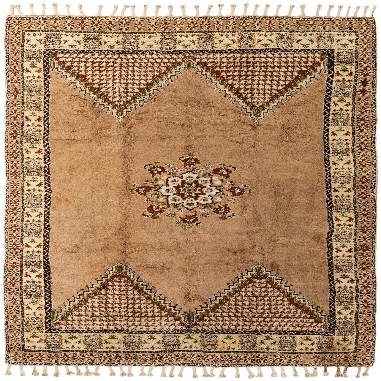 A rectangular 8x12 Moroccan shag rug in brown and ivory with a central medallion and tribal patterns.