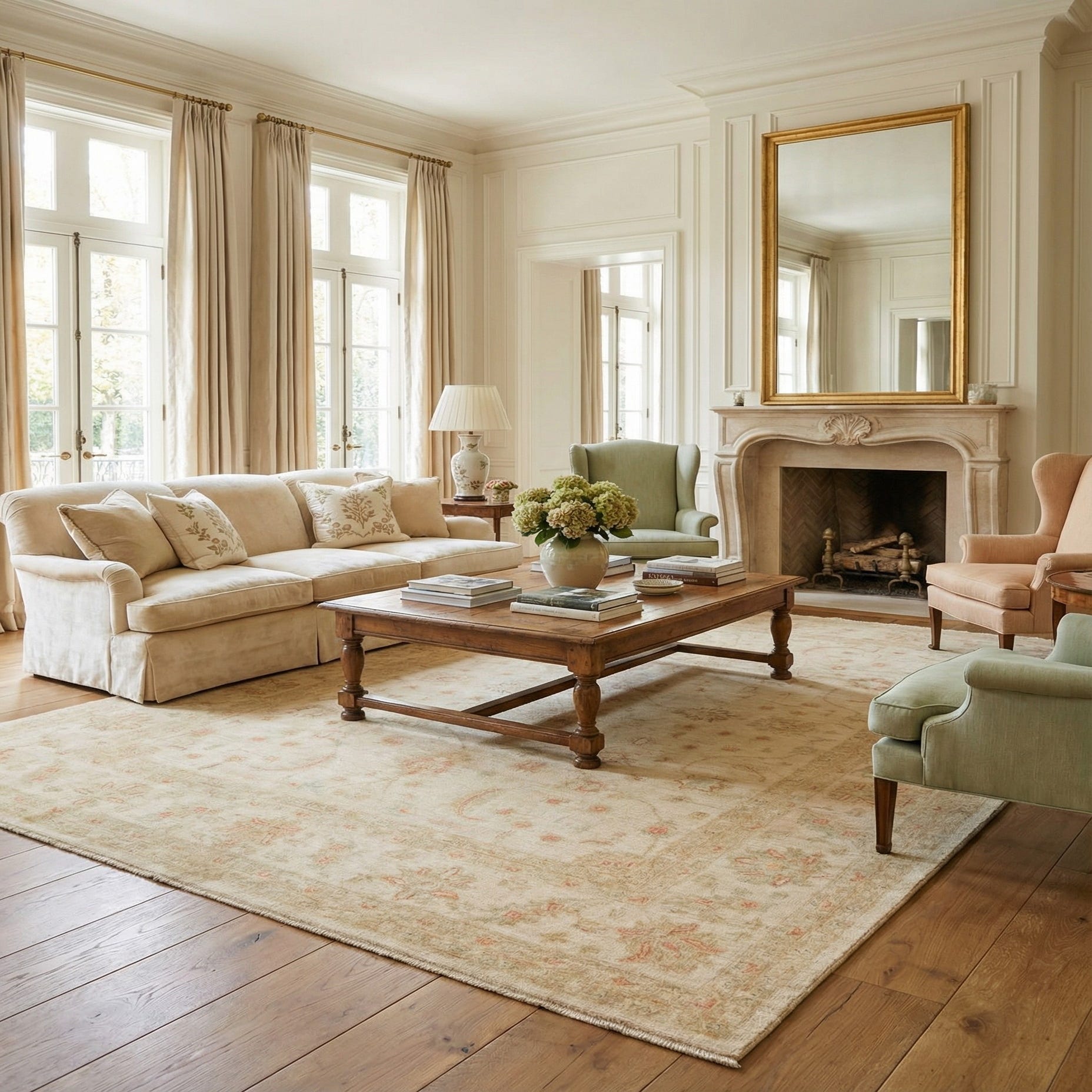 Well-suited to living rooms, formal dining areas, or layered in a bedroom, this rug anchors seating groups and dining tables without overwhelming a space. It pairs naturally with warm woods, linen upholstery and leather seating, and complements both traditional and transitional interiors; use olive or rust accents to pick up the subtle color notes, or keep the palette neutral with creams and golds for a calm, cohesive look. The rug’s muted palette and textured hand-knotted wool make it a versatile choice for rooms that favor understated, classic styling.