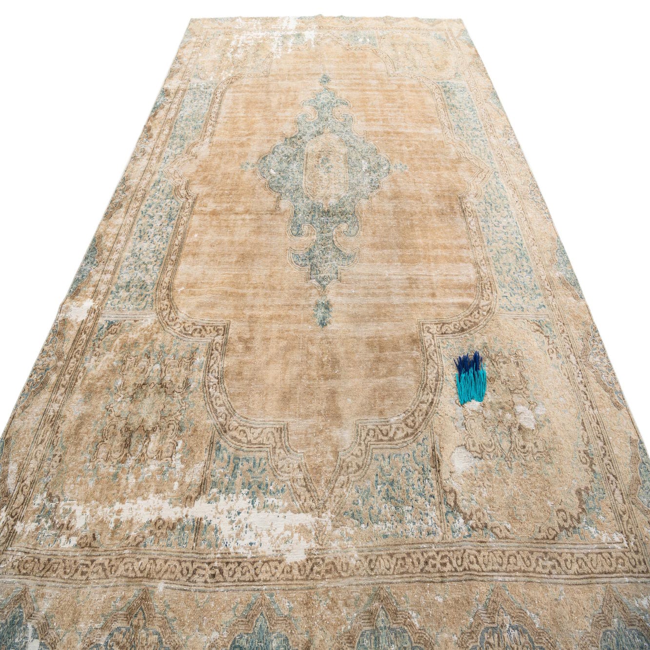 An 8x12 rectangular Ultra Vintage wool rug featuring a distressed Persian medallion pattern in browns, tans, and ivories with teal accents.