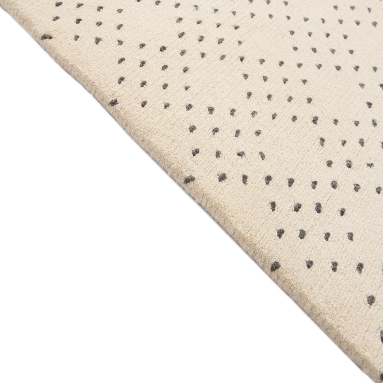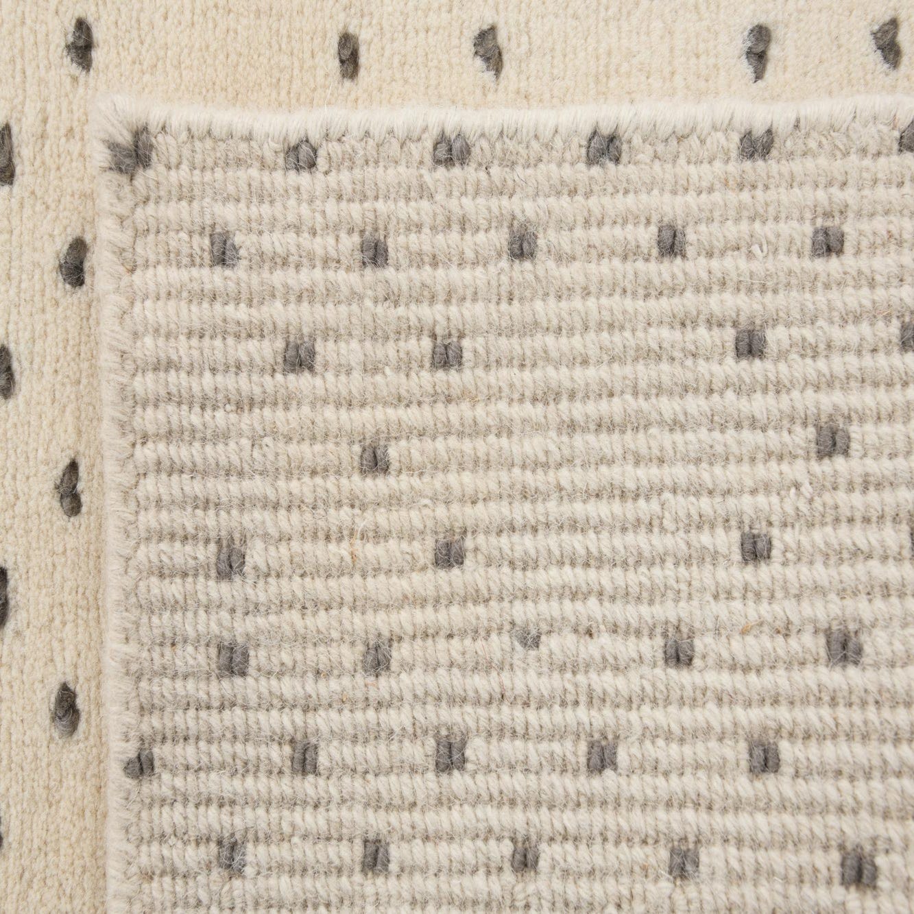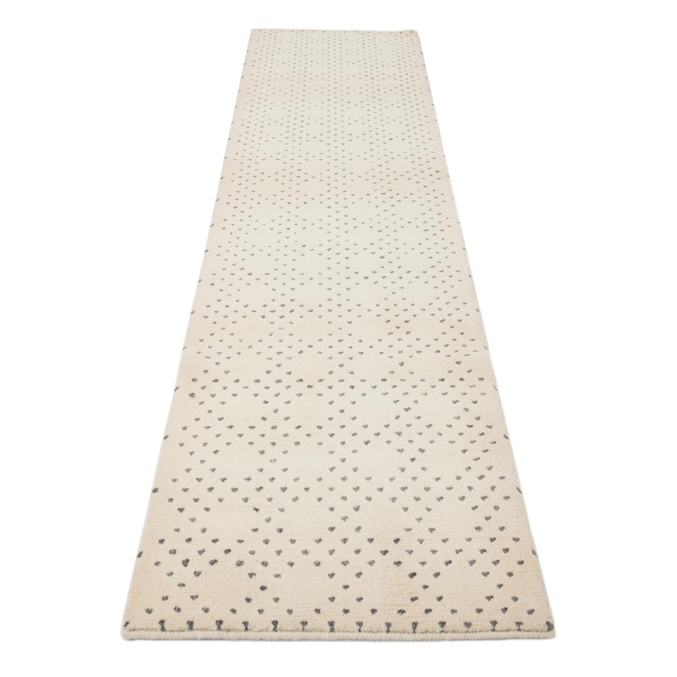 The Darya collection presents a hand-knotted 9 Ft Runner rug, crafted from 100% wool for enduring quality and a soft texture that adds comfort underfoot. The color palette features a neutral beige background, embellished with a simple yet engaging pattern of dots in light green and gray hues. This minimalist design ensures versatility, rendering the rug suitable for a range of interior styles including contemporary, Scandinavian, or even a more traditional space seeking a touch of modern simplicity.