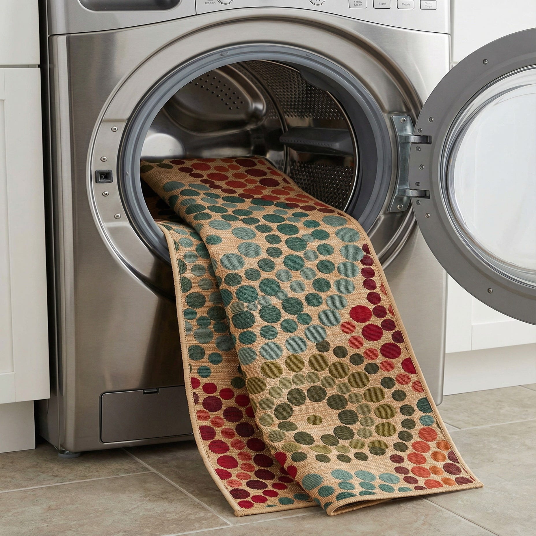 A 9 ft runner rug with a modern abstract pattern of various sized circles in shades of brown, tan, red, and teal on a cream background, suitable for a hallway or patio.