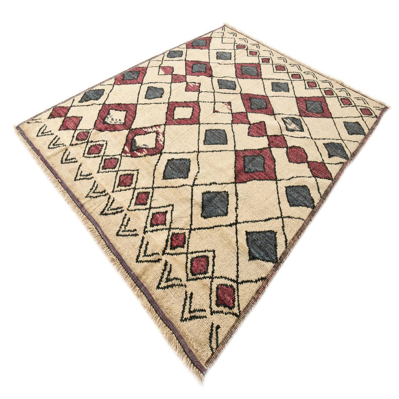 The rug showcases a Beige background, tastefully complemented by a rich palette of Black, Blue, Burgundy, Gray, Navy Blue, and Pink in its intricate geometric pattern. The design features repeating diamond motifs bordered by linear accents, infusing a touch of tribal elegance into any space.