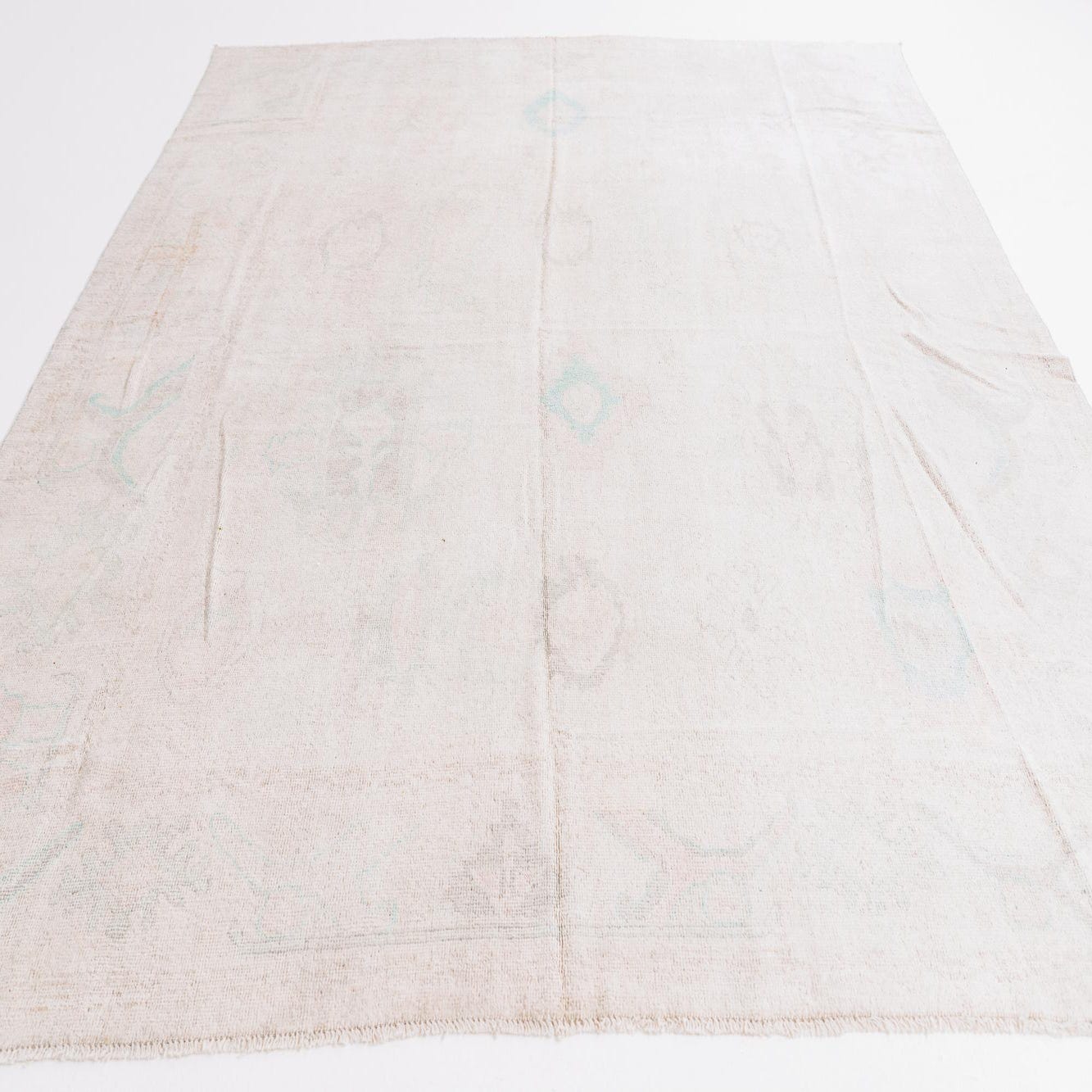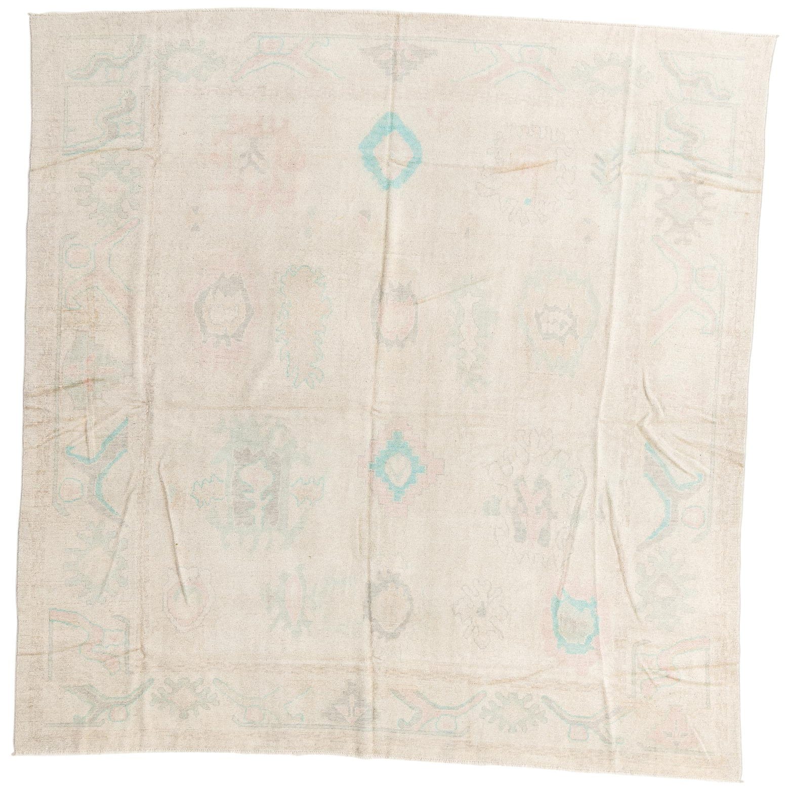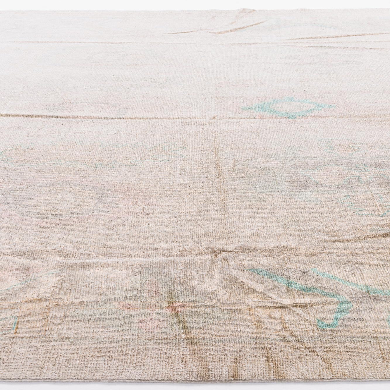 This rug's muted tones and intricate patterning make it suitable for a variety of decor styles, from contemporary to traditional. It could serve as a grounding element in a minimally decorated space or as a complementary layer in a room with rich wood tones and vintage furniture. The Oushak rug's timeless quality ensures it fits seamlessly in a formal living room, spacious dining area, or a grand master bedroom.