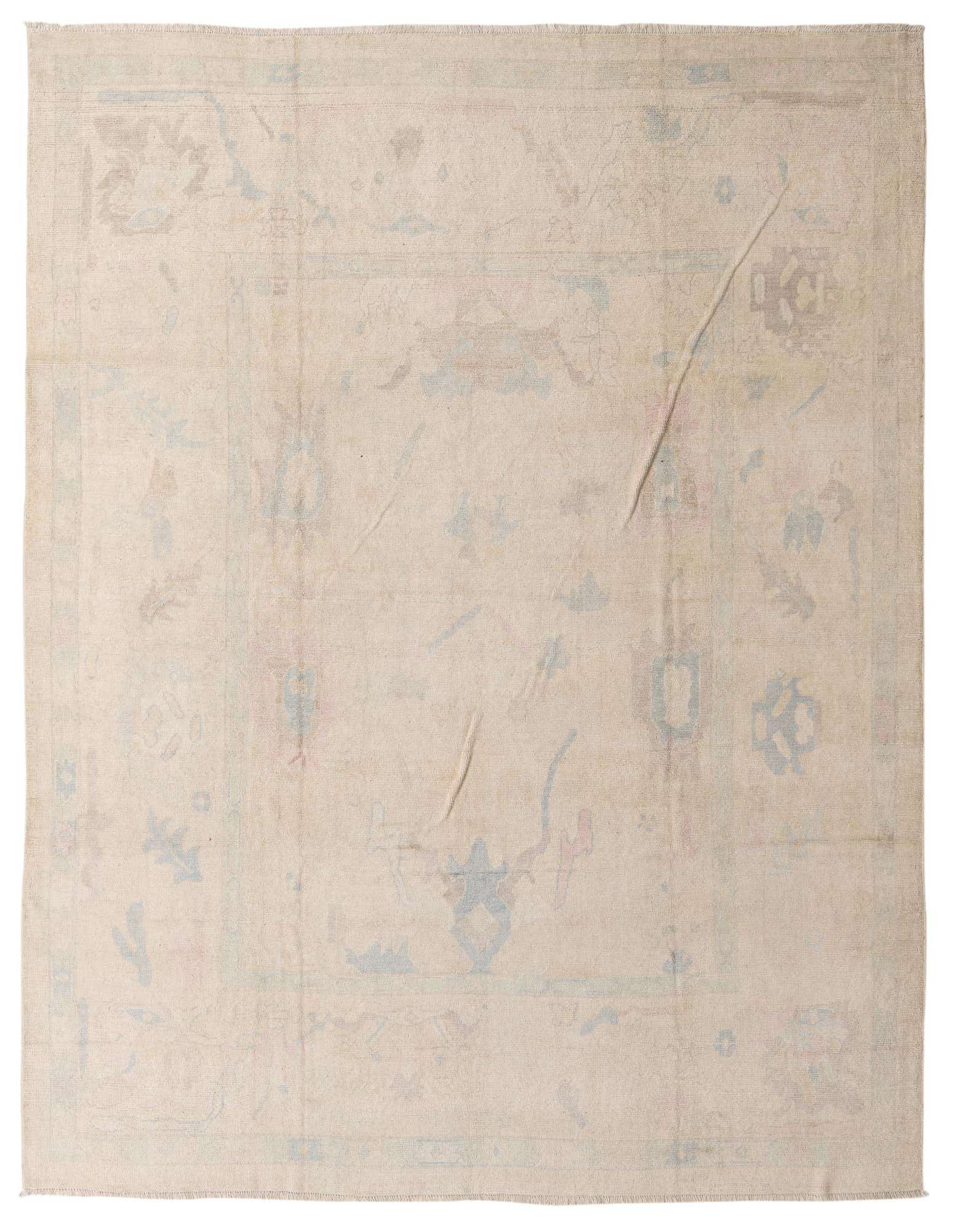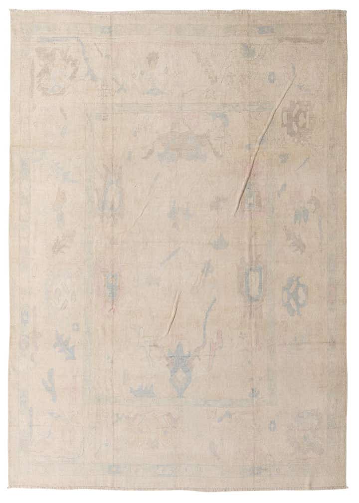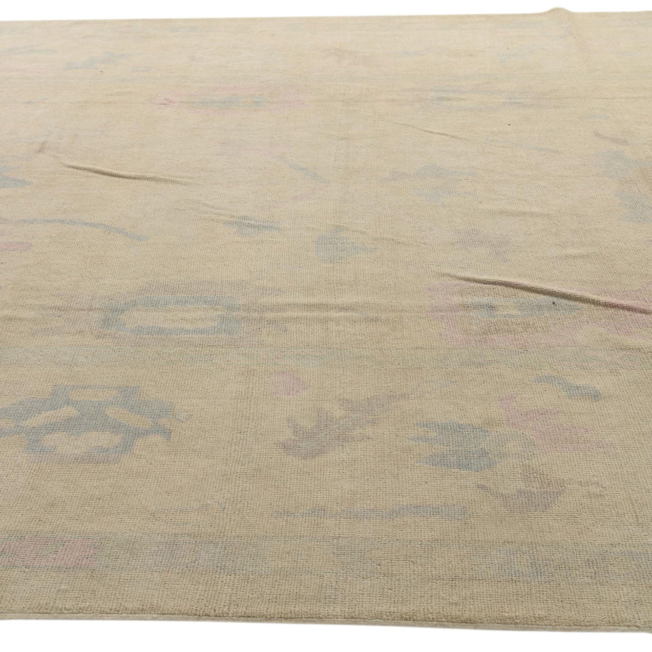 This Oushak Collection rug is a hand-knotted piece, crafted meticulously from 100% wool and sized at 9x11, offering a durable and substantial floor covering suitable for various spaces. The rug showcases a primarily beige background, enriched by a pattern that features tasteful accents of blue, pink, and ivory. Its traditional Oushak design incorporates a faded, gently distressed look, giving it a sense of history and an established character.