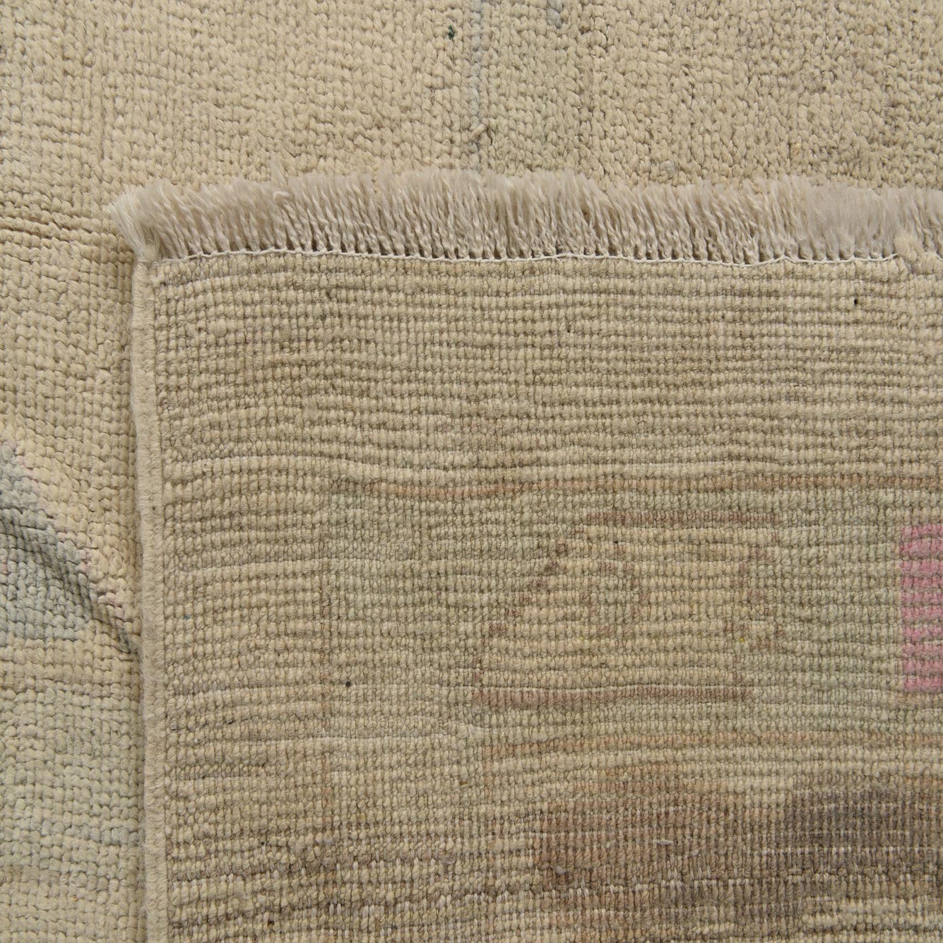 Primary color is Beige. Colors in this rug include: Beige, Blue, Pink, Ivory.