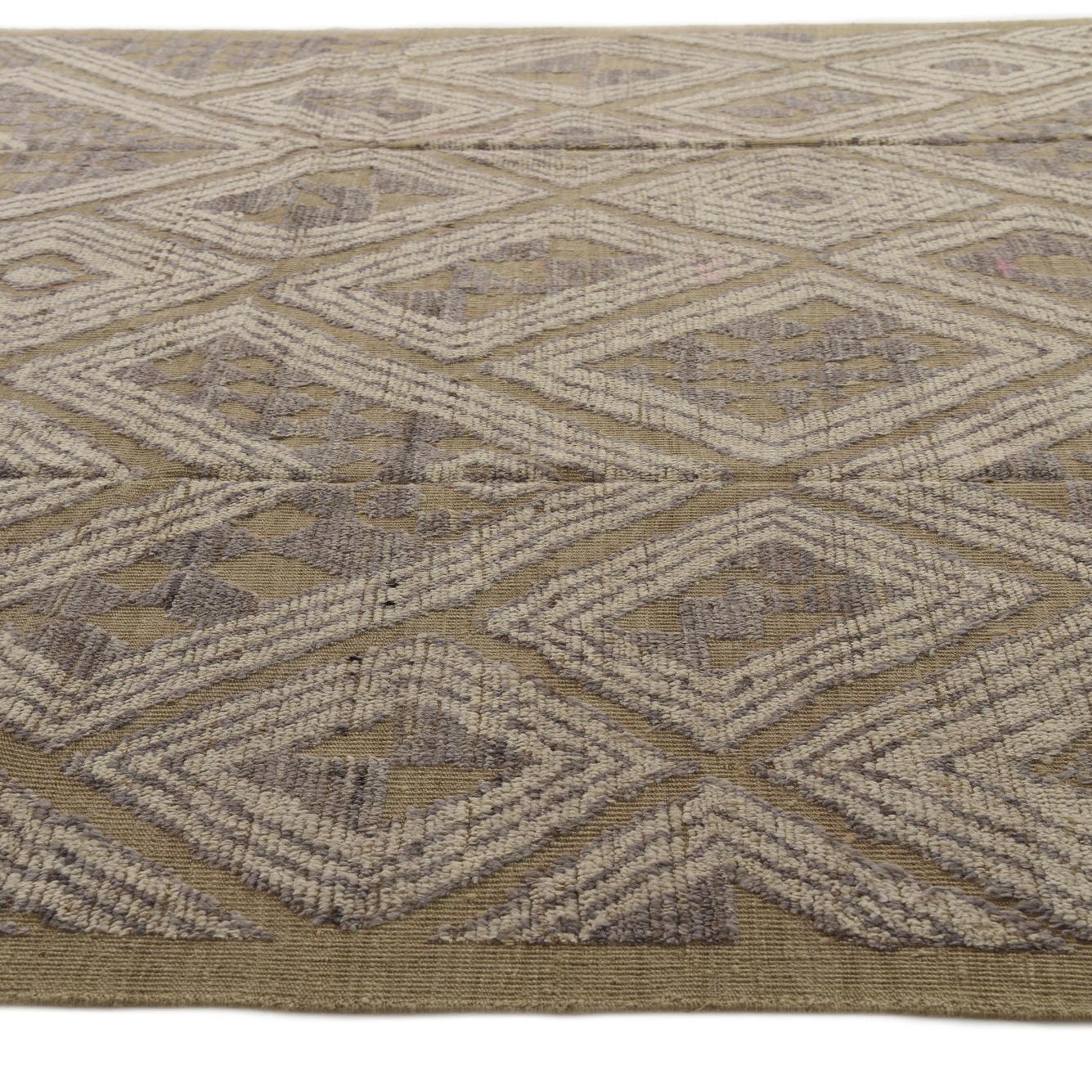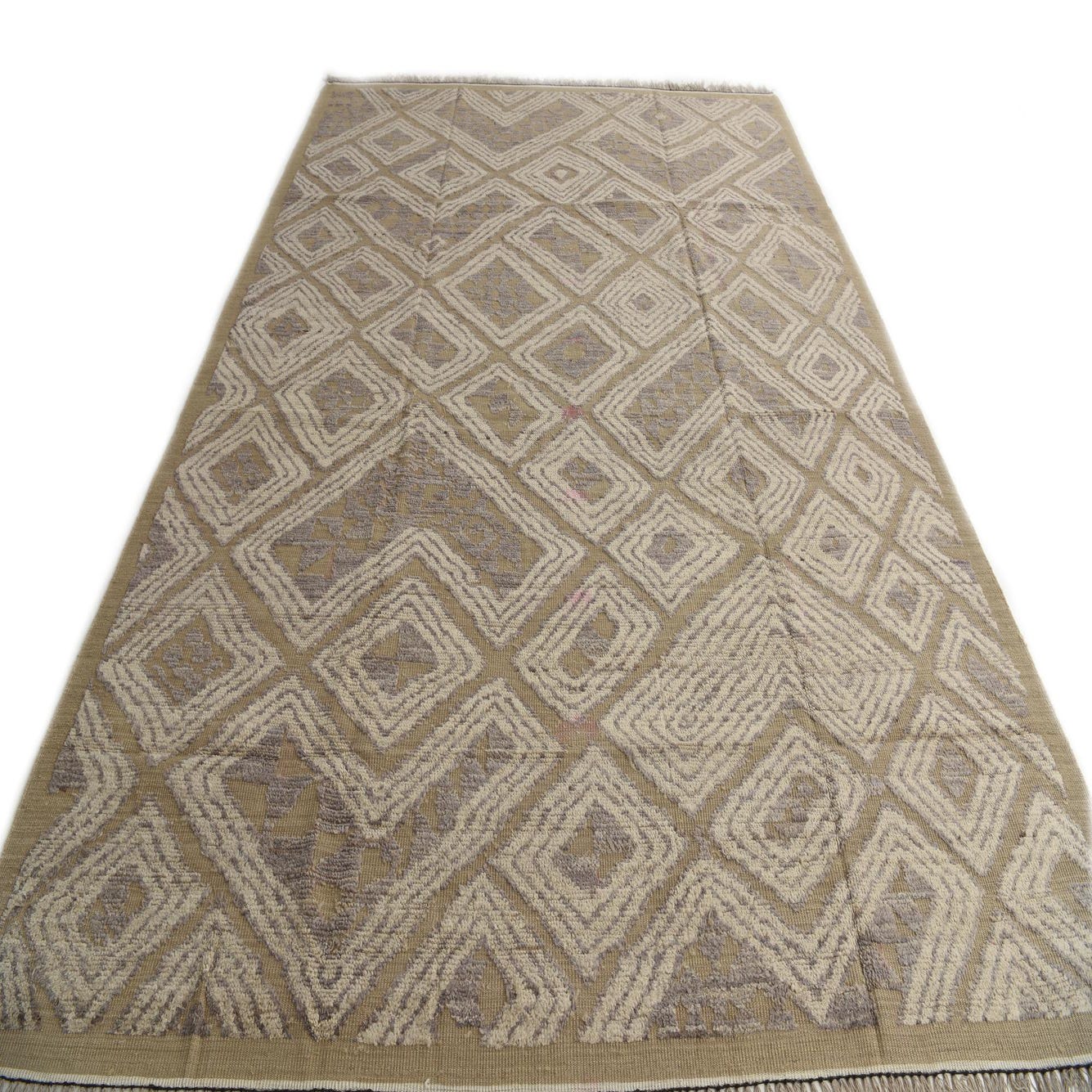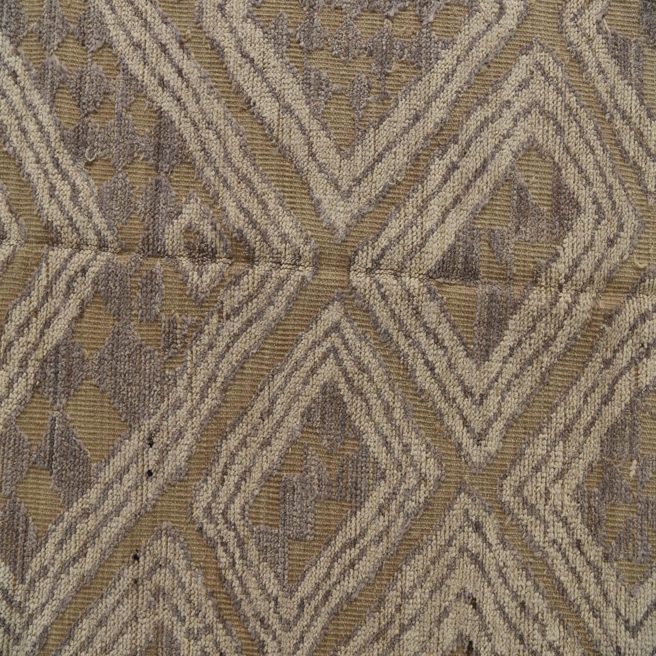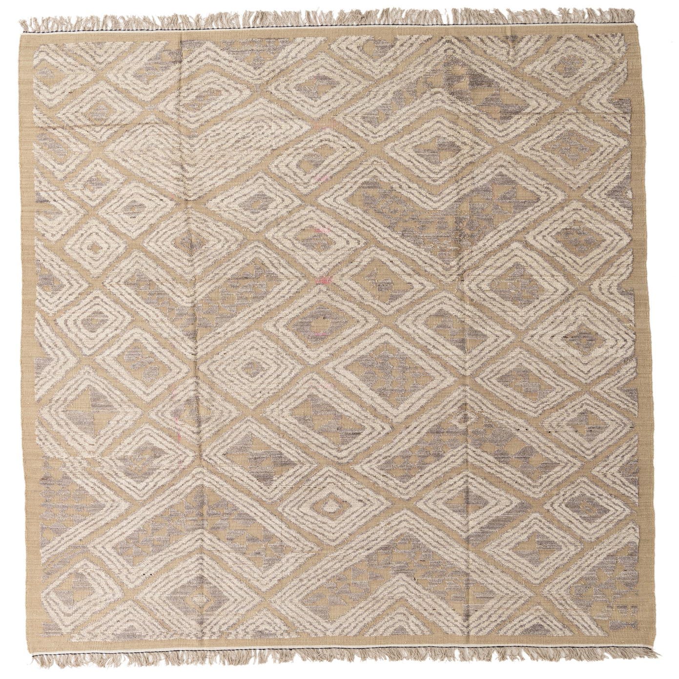 A 9x12 rectangular Darya rug with a modern abstract diamond pattern in brown, tan, and ivory.