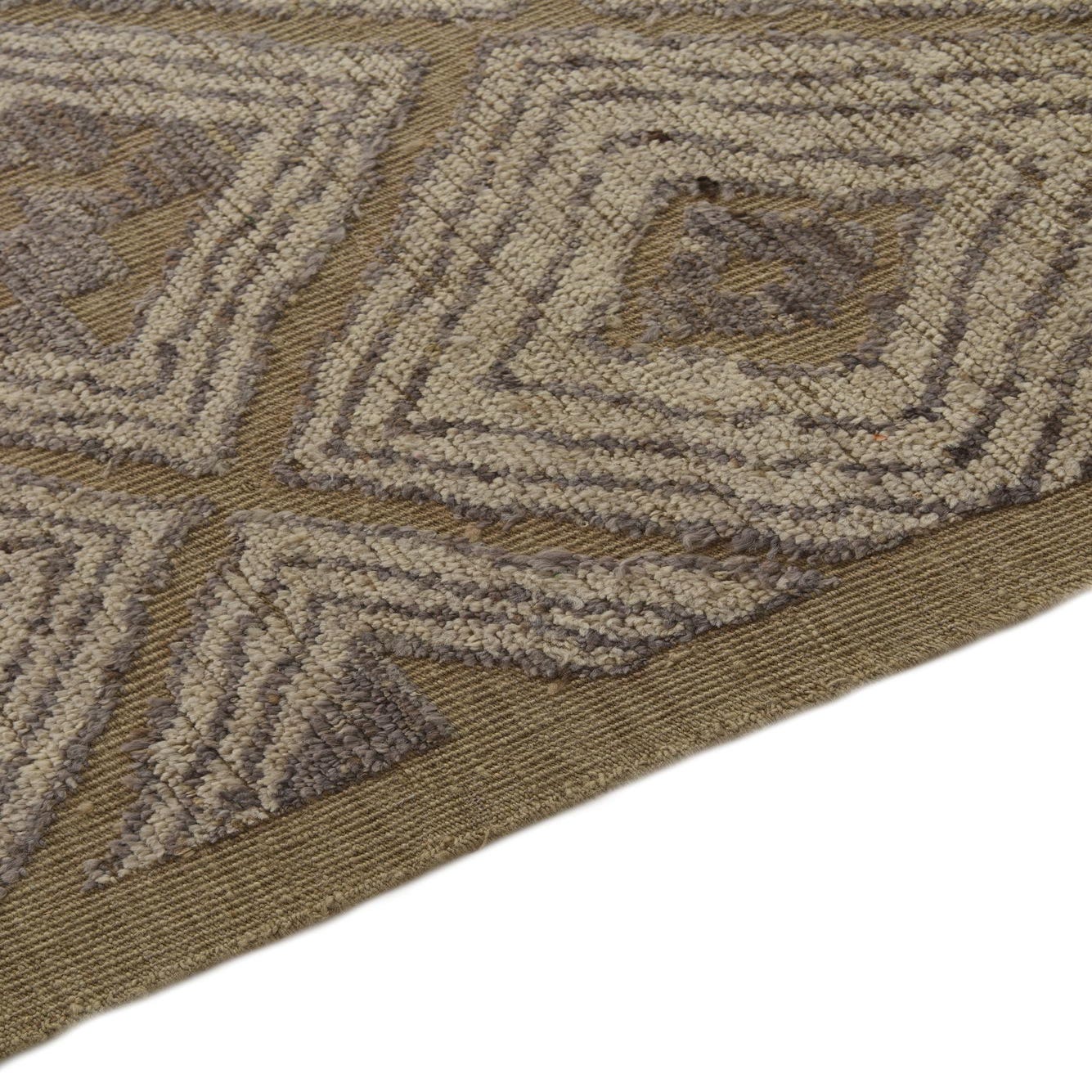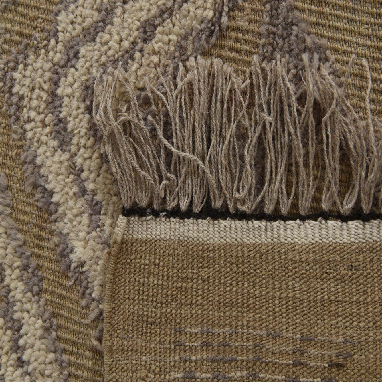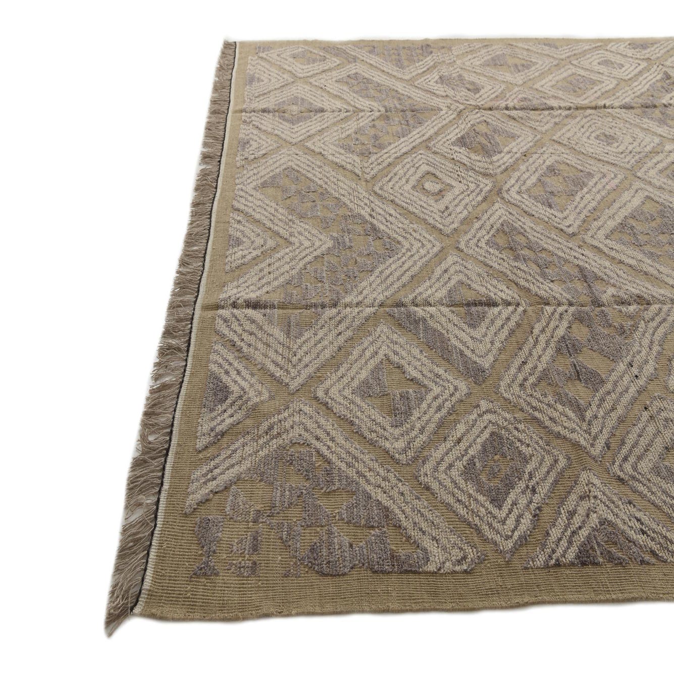 A dynamic geometric pattern creates a sense of movement and depth, while the subtle interplay of shades adds richness and versatility. The rug's design features crisp lines and shapes that bring a contemporary flair to the traditional craftsmanship. Finished with an elegant fringe, this piece adds a refined touch to any room.