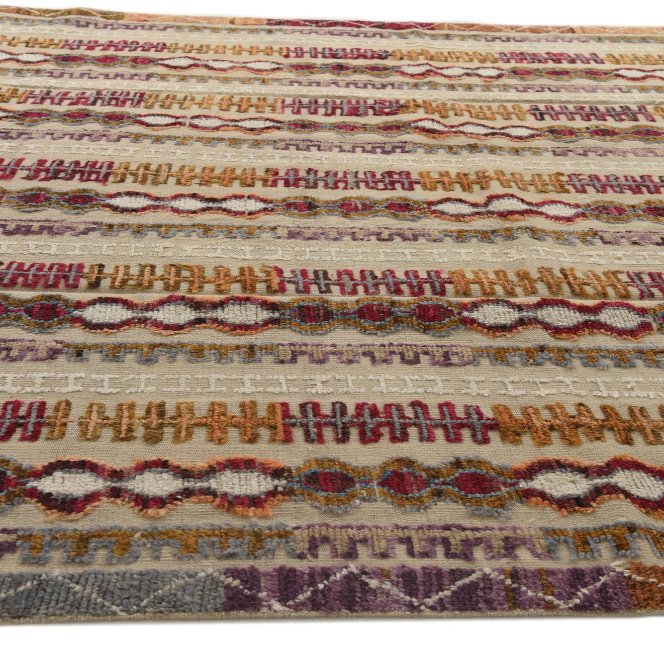 A 9x12 rectangular Darya rug with a modern pattern of vertical stripes in browns, tans, and creams, accented with colorful geometric details and fringe.